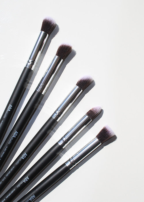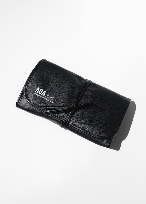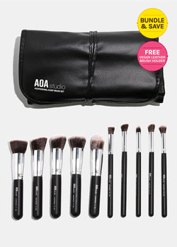 This is the full set of 10 AOA studio brushes- 5 Face brushes and 5 Eye Brushes. When you purchase the full set you will receive the AOA black, vegan, leather brush roll for free! The sleek, black, vegan-leather brush roll keeps brushes organized and clean so you can take your brushes with you anywhere. Roll, tie and go!