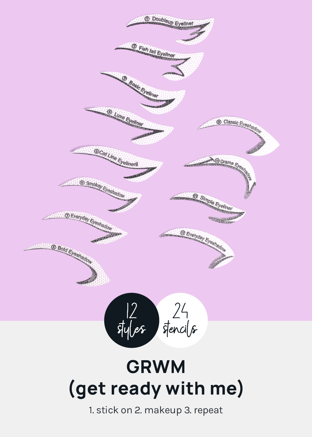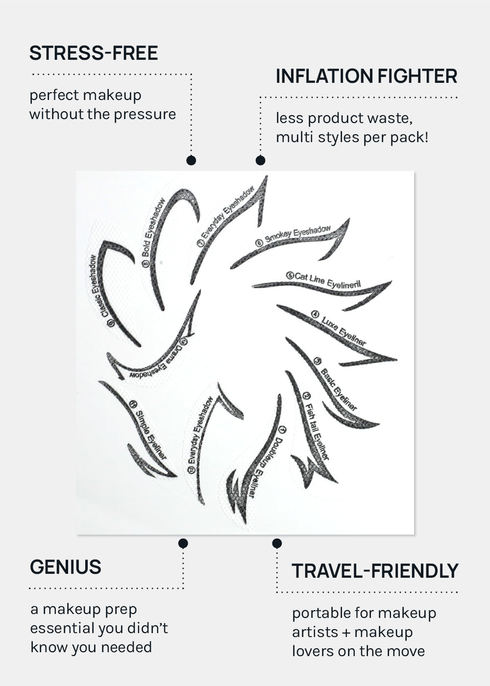 12 styles • 6 eyeliner + 6 eyeshadow styles • 24 Stick-on Stencils