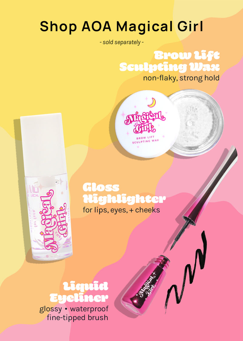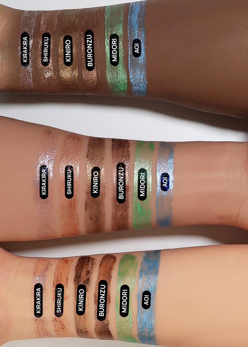 Transform your eyes to catch the light + release Your Inner Magical Girl everywhere you look: add reflective shimmer to your eyelids in vegan, non-flaking, + long-wearing, formulas. Create a metallic eye look in 1 swipe OR add reflective shine anywhere: topper for lips, highlight cheekbones, inner eye corners.