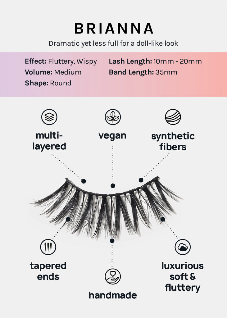 These lashes are vegan, cruelty-free, and made from synthetic fibers. The band is thicker, therefore can be reused multiple times with proper care and cleaning!