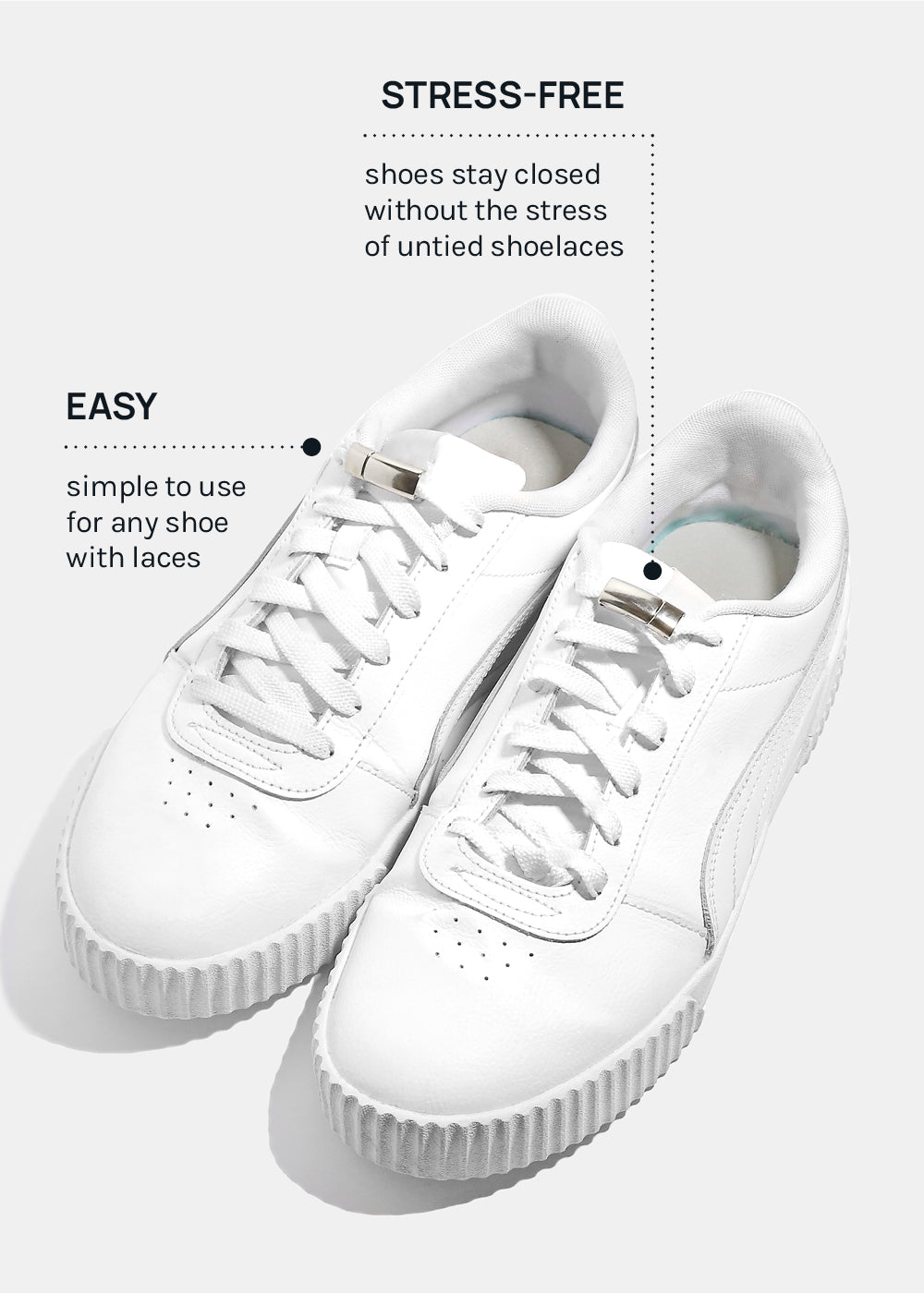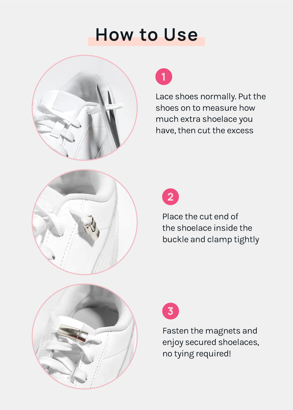 - Fasten the magnets and enjoy secured shoelaces, no tying required!