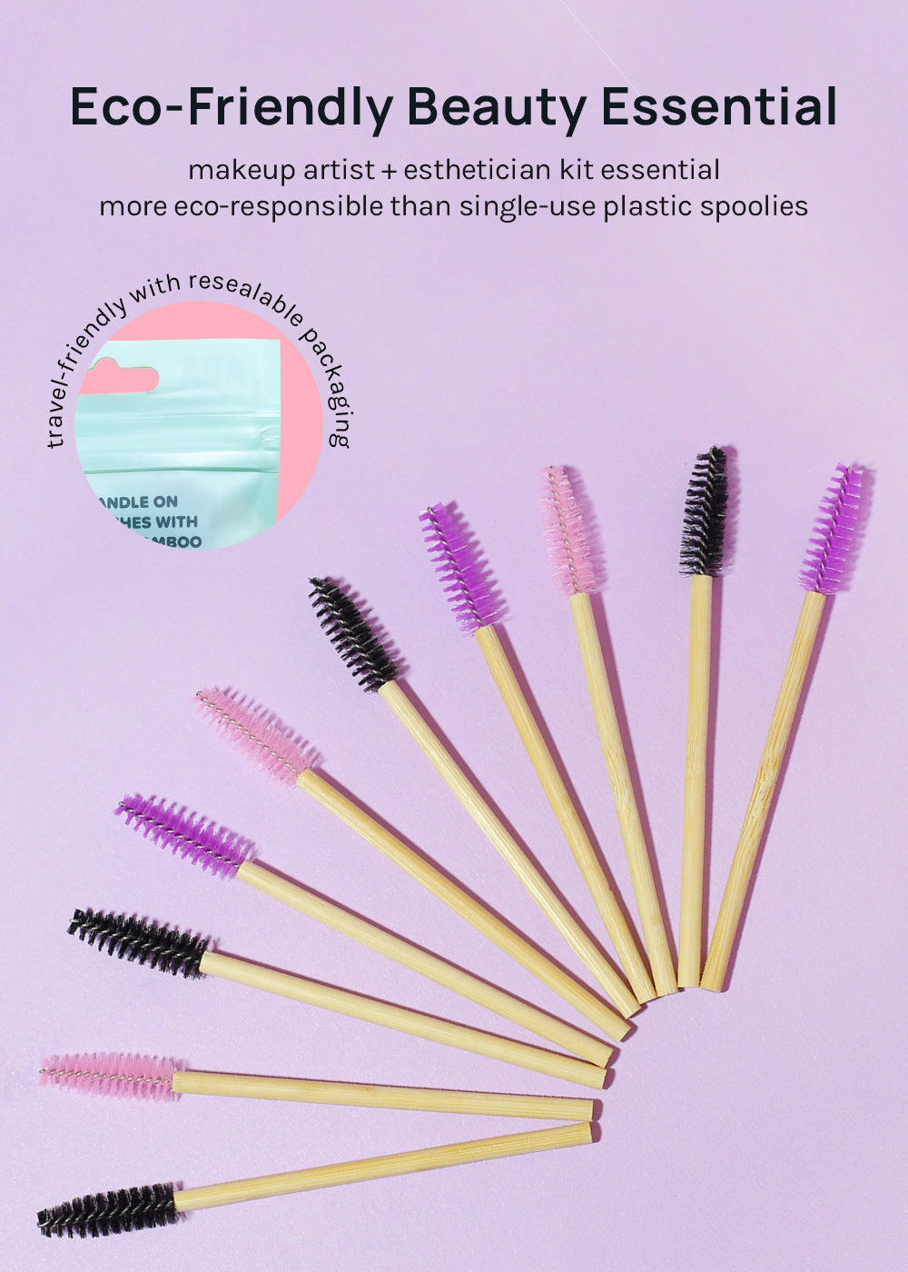 Our strong bamboo brow + lash brushes feature eco-friendly bamboo wands for flawless grooming. Our disposable lash brushes are great in your makeup bag, makeup artist + esthetician kits, salons, + more.