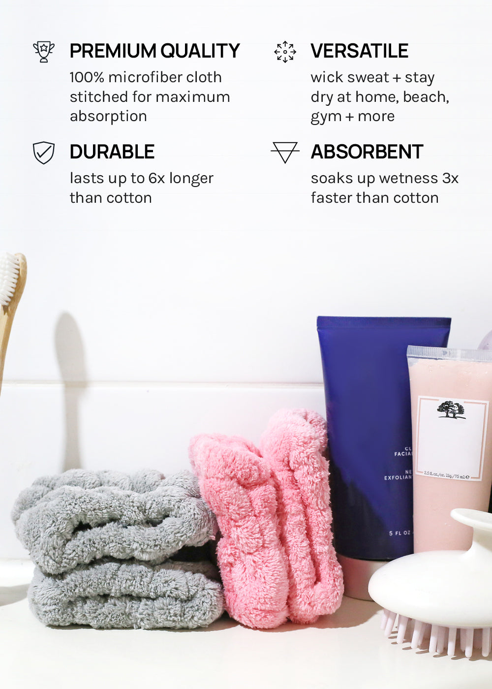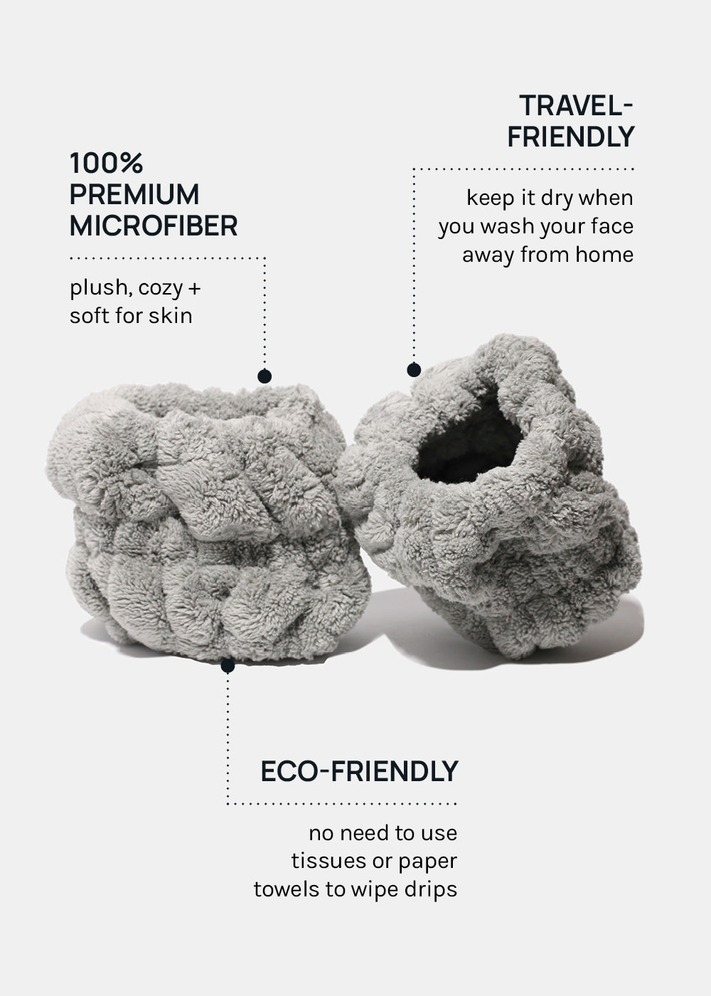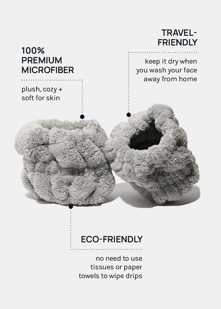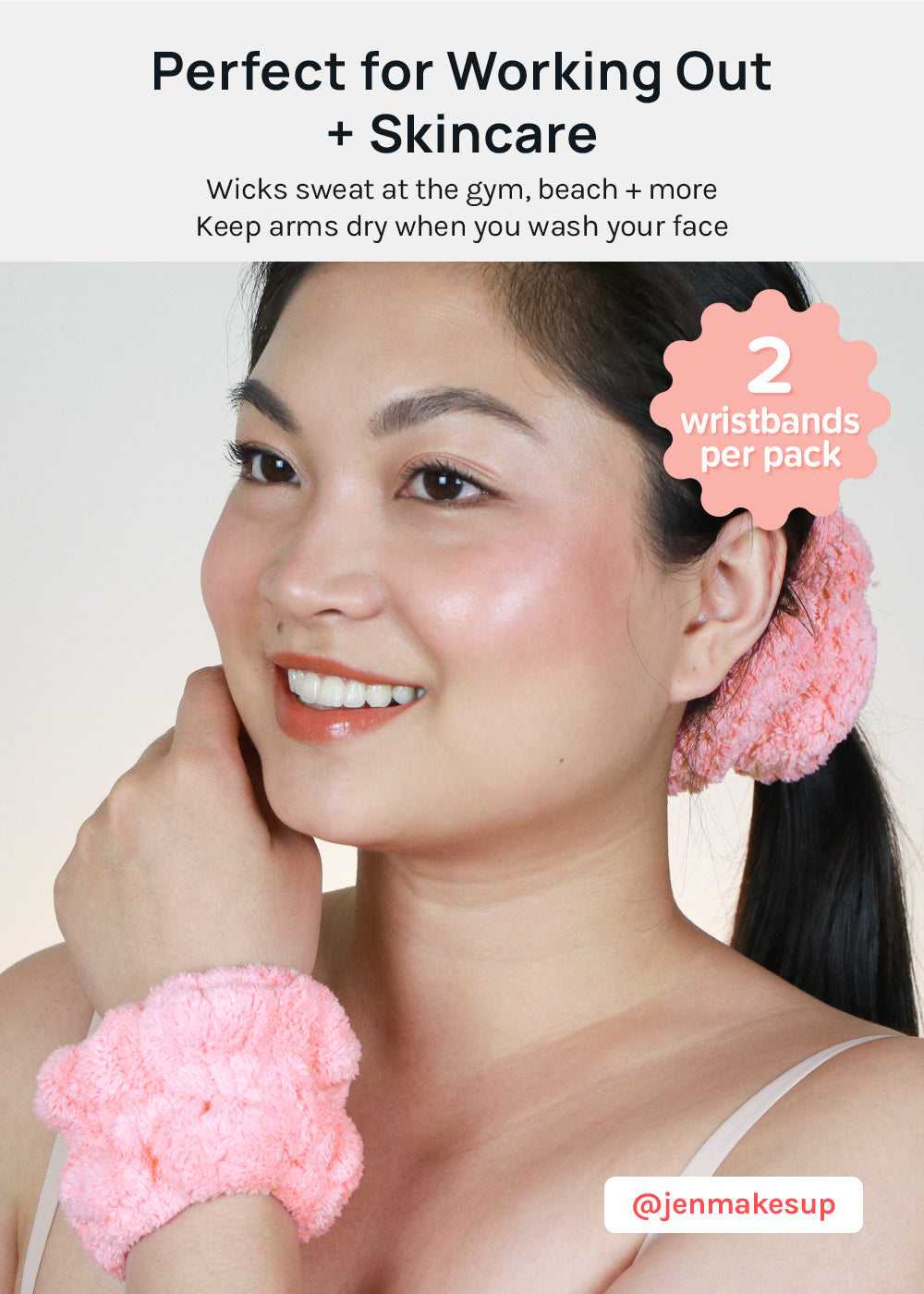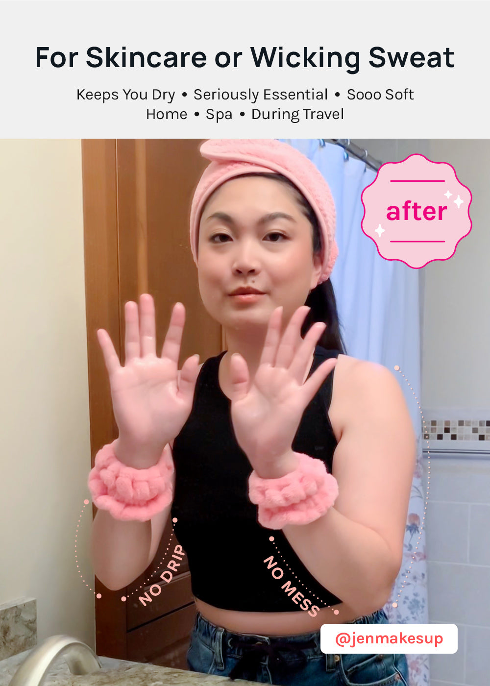Made of thick, absorbent microfiber, these wristbands are an absolute essential that will change the way you wash your face by preventing water from drenching your arms + sink area, absorbing sweat during workouts, at the spa, or masking during your skincare routine.