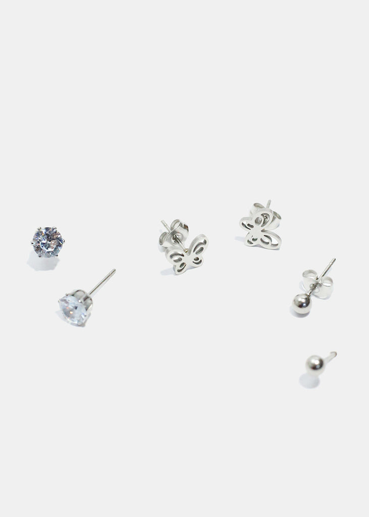 3-Pair Butterfly & Gemstone Stud Earrings