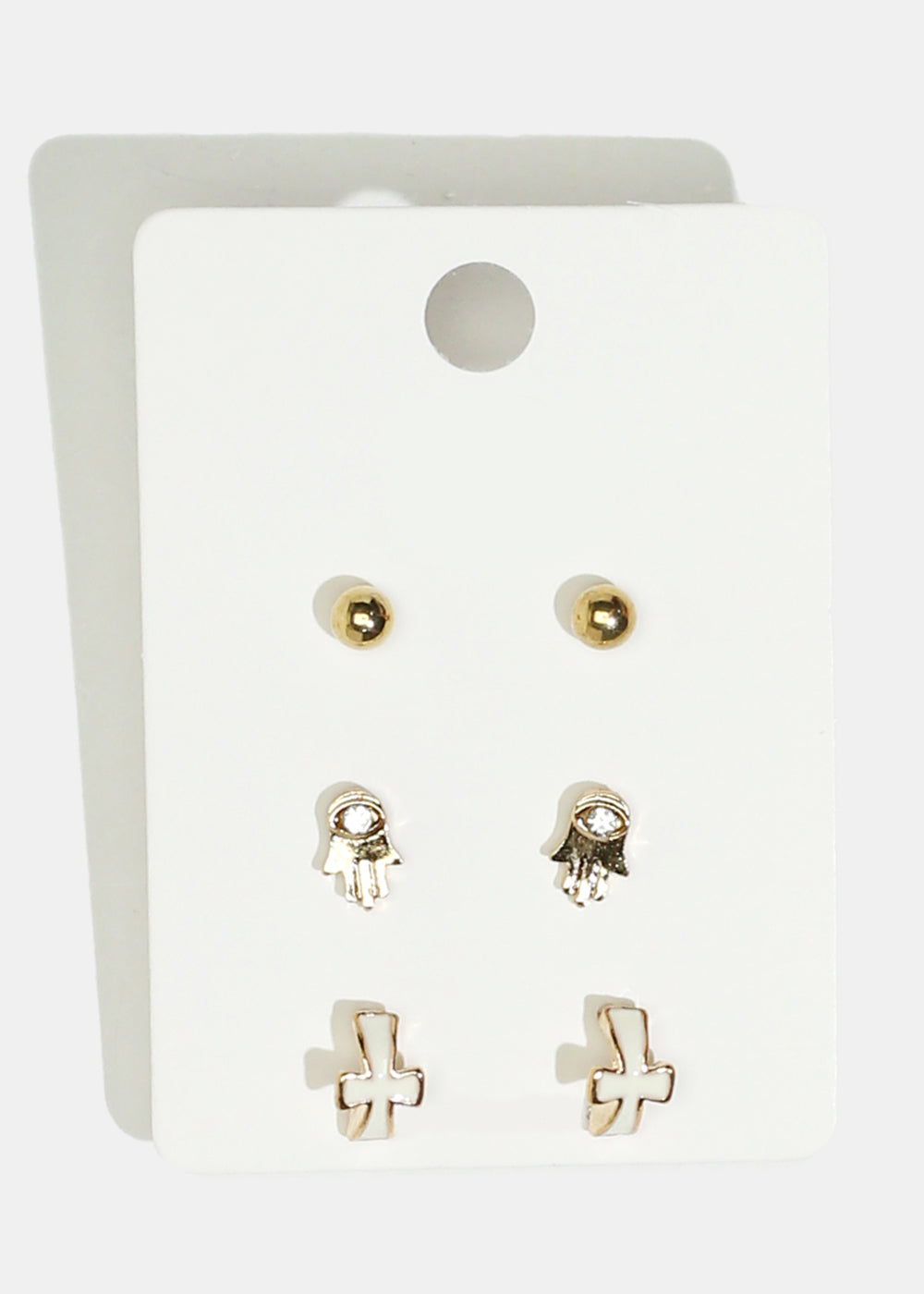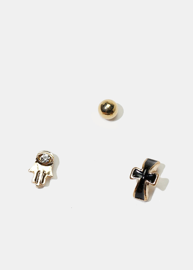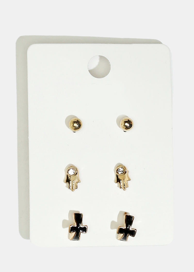 3-pair set of earrings featuring hamsa hand and cross stud earrings that you can style with your everyday look. Must-have earrings to your jewelry collection.