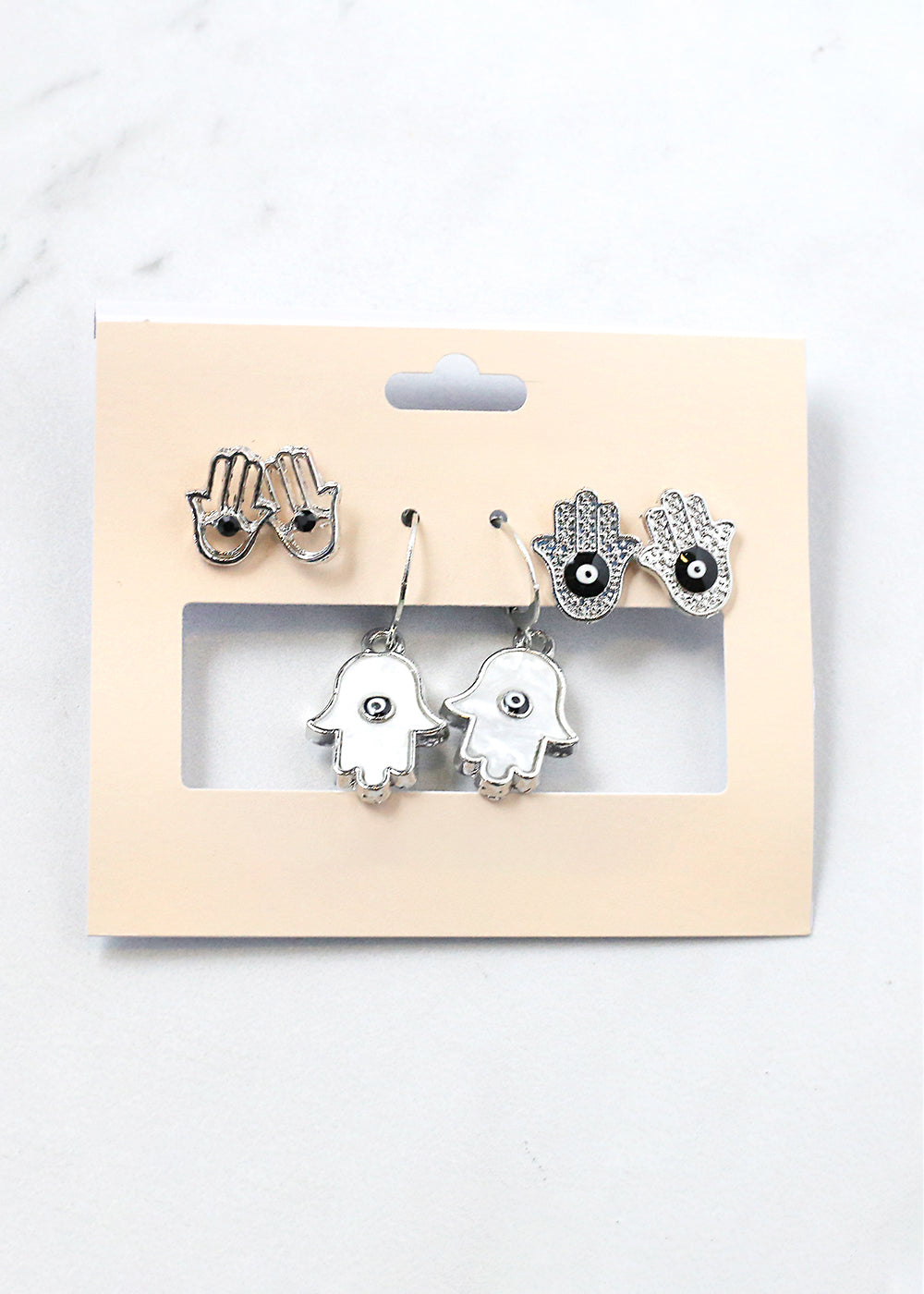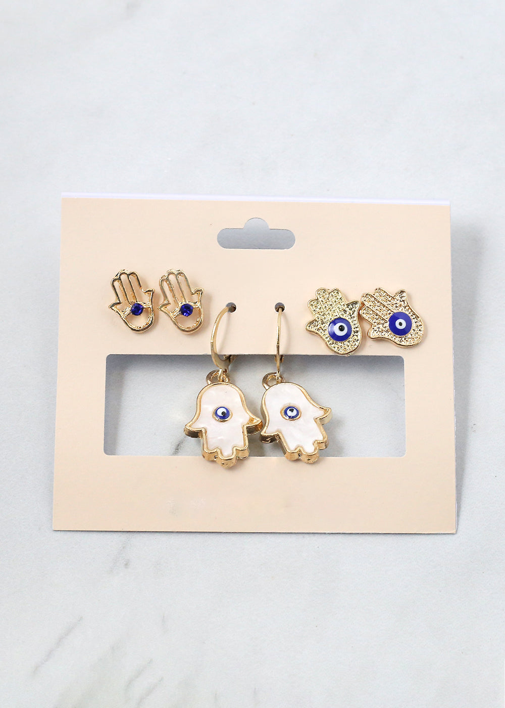 - 3 pair hamsa hand + evil eye earrings