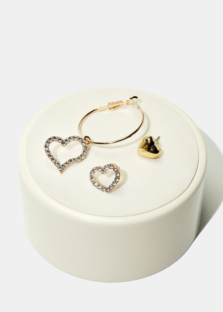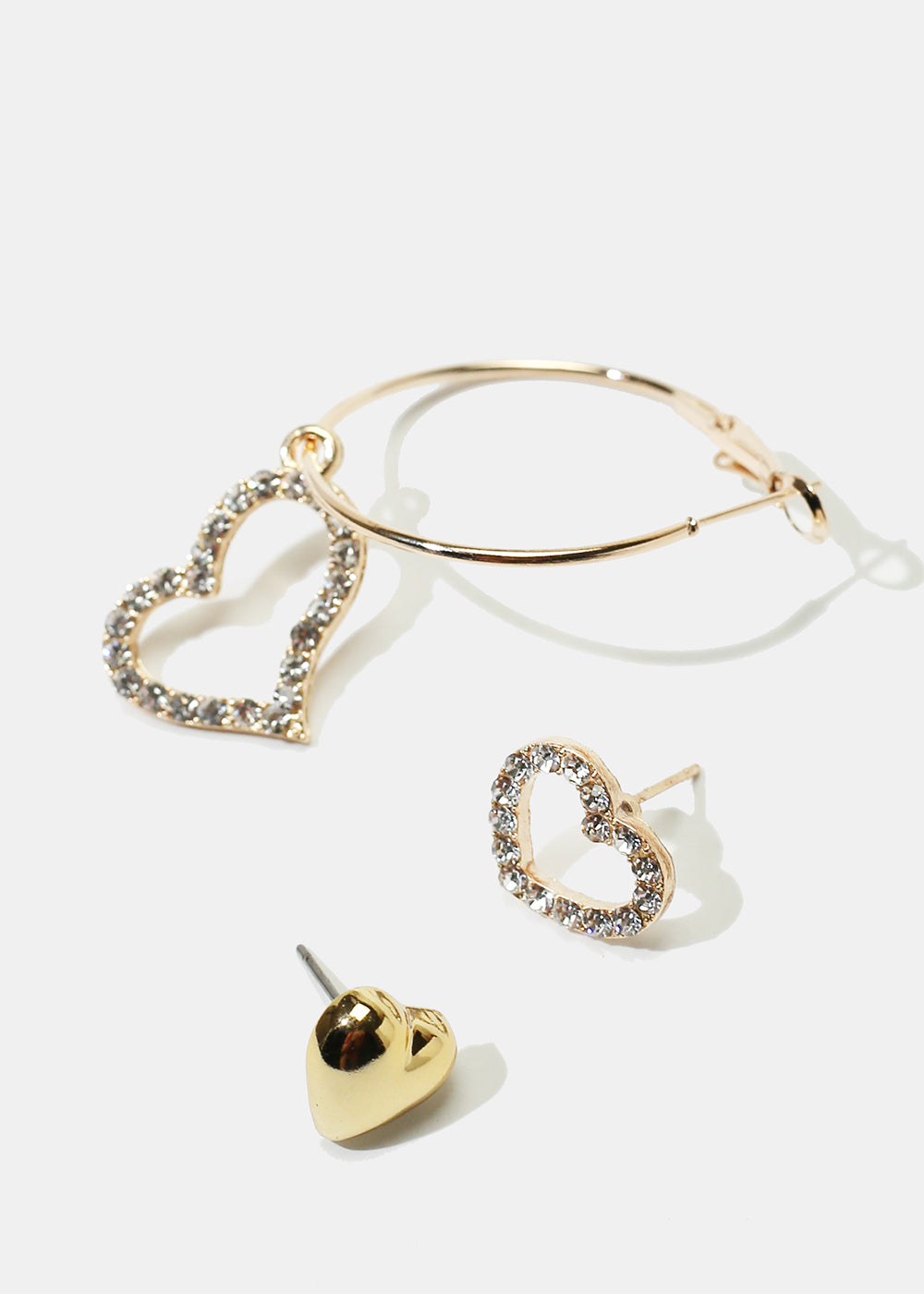 Stock up on your earrings with these 3-pair heart stud and hoop earrings set!