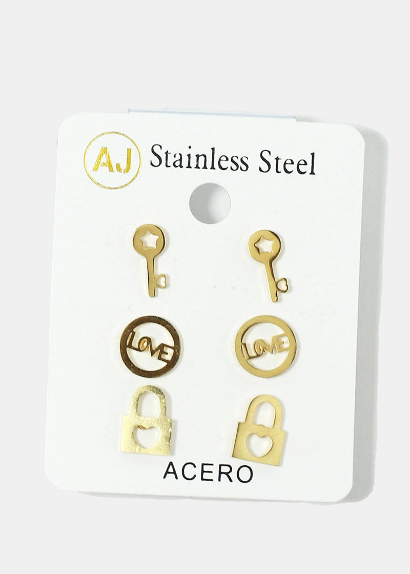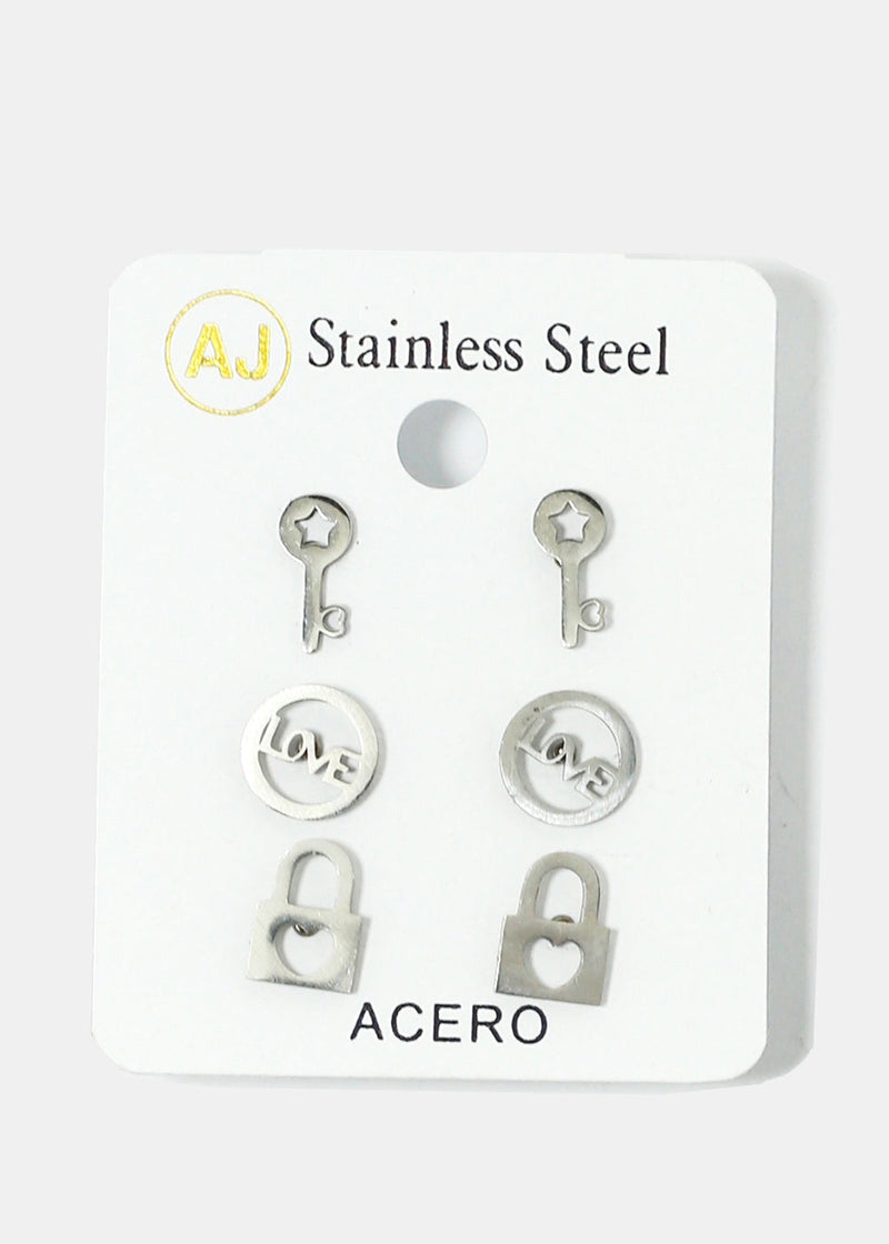Get this 3-pair set of stud earrings featuring multiple styles such as key, lock, and "LOVE" earrings. Complete your everyday look with these chic earrings. These durable stainless steel earrings are perfect for a gift to a loved one!
