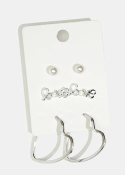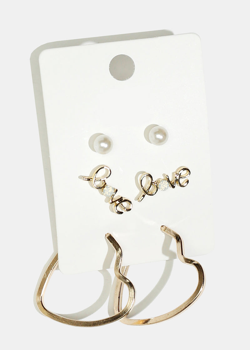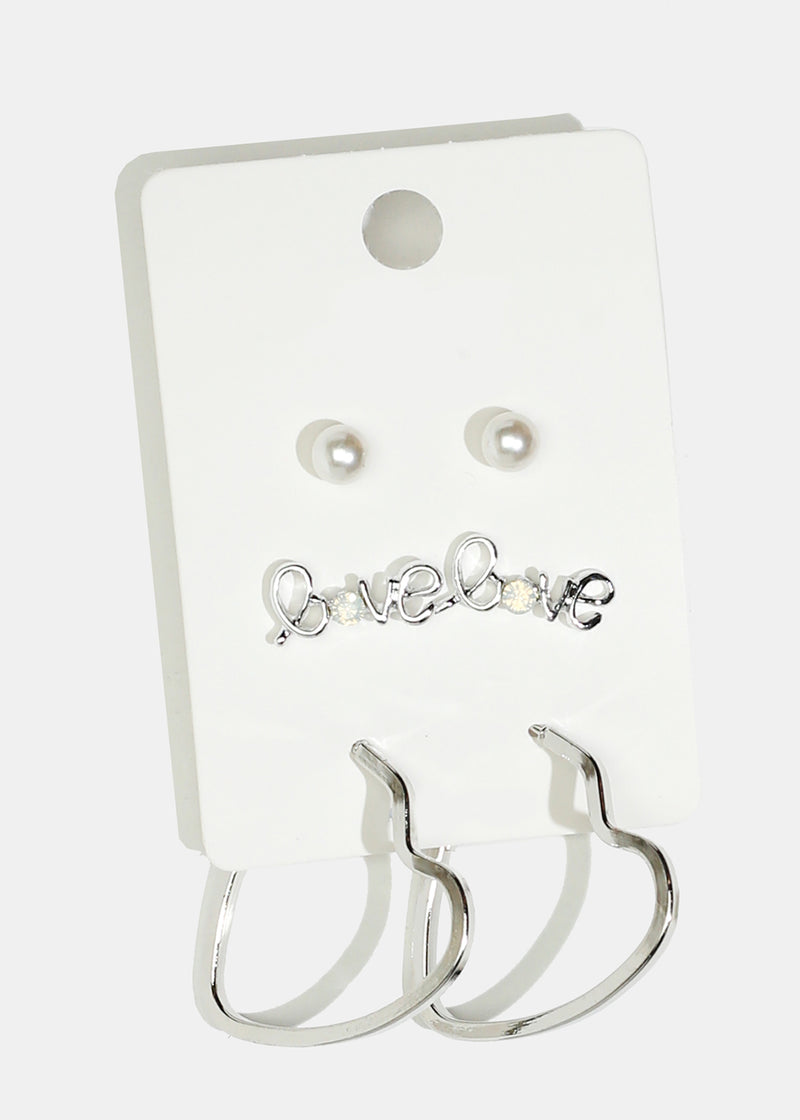 3-pair earrings set featuring "LOVE" stud and heart hoop earrings! Collect this set in gold and silver color.