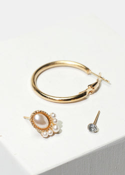 3-pair earrings set featuring pretty pearl stud and hoop earrings. Stylish pair of earrings that go with any look!