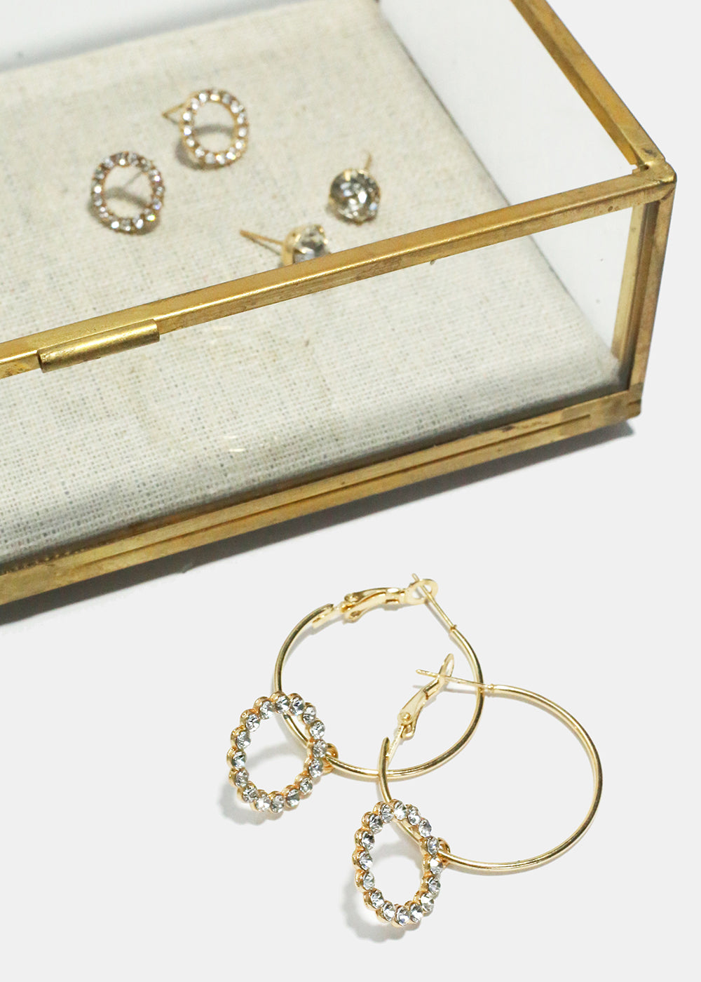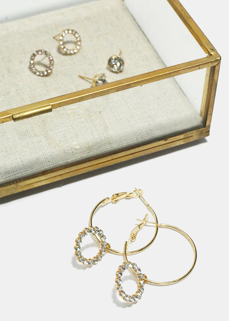 3-pair set of earrings featuring rhinestone studded hoop and stud earrings that you can style with all of your looks. Add these beautiful earrings for the perfect chic and stylish look.