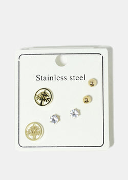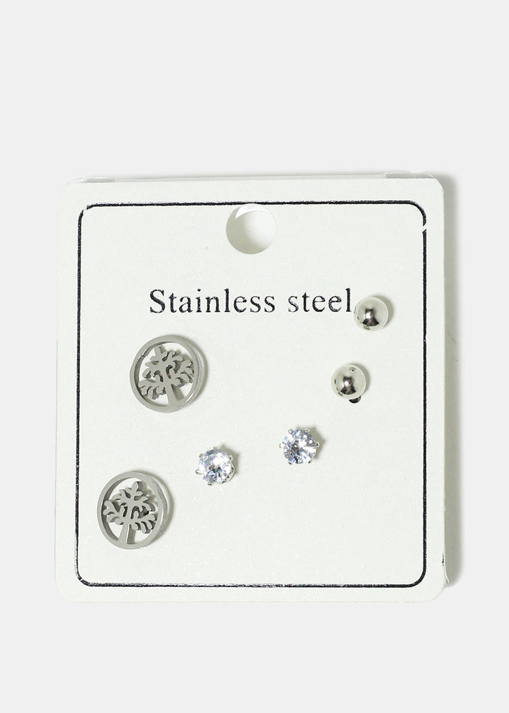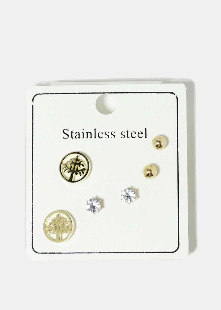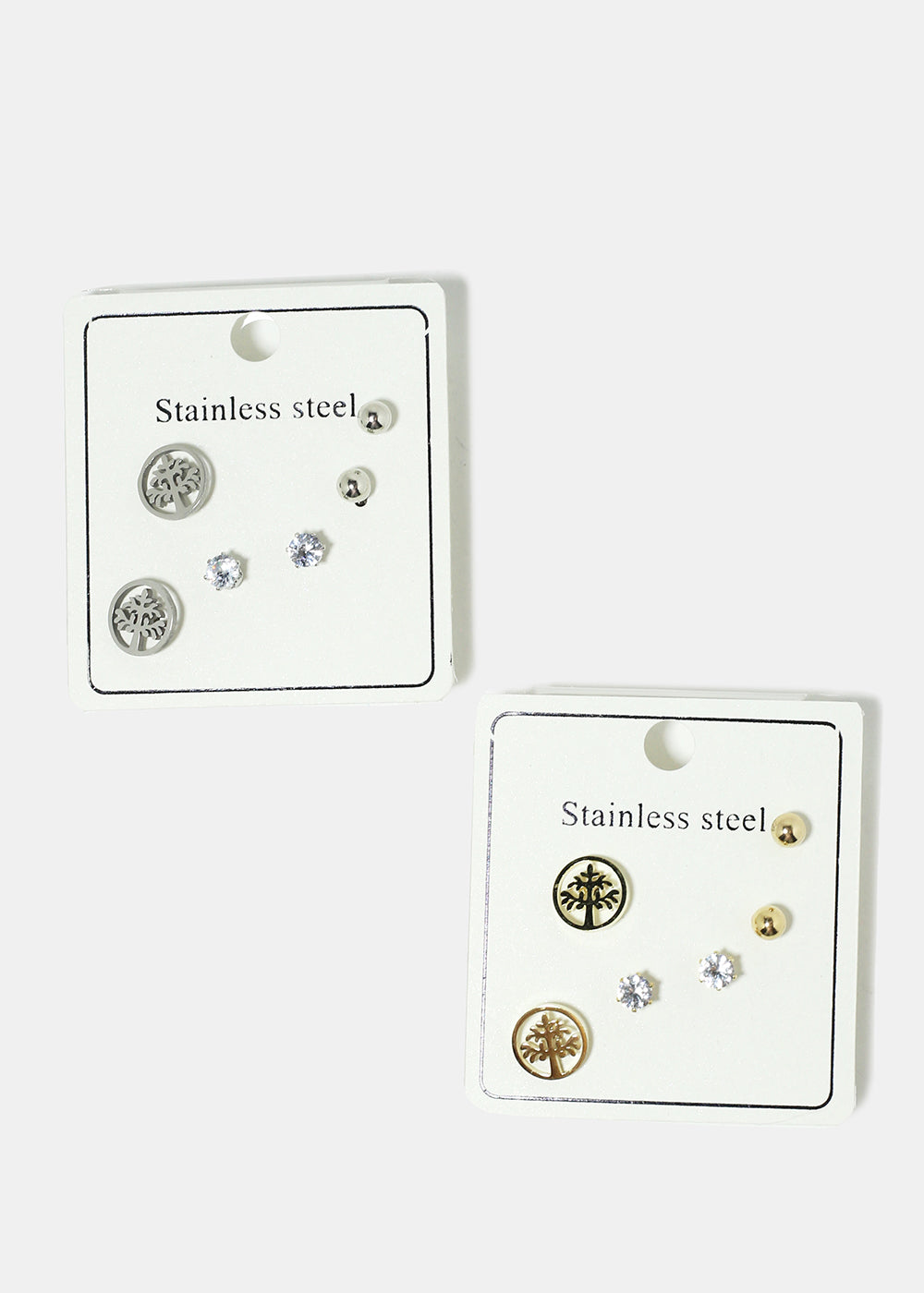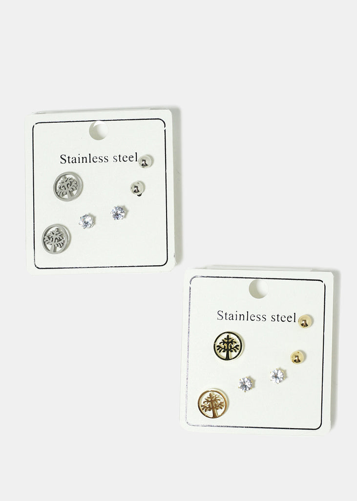 Get this 3-pair set of stud earrings featuring multiple styles such as tree of life, rhinestone, and ball stud earrings. Collect these durable earrings in gold or silver color!