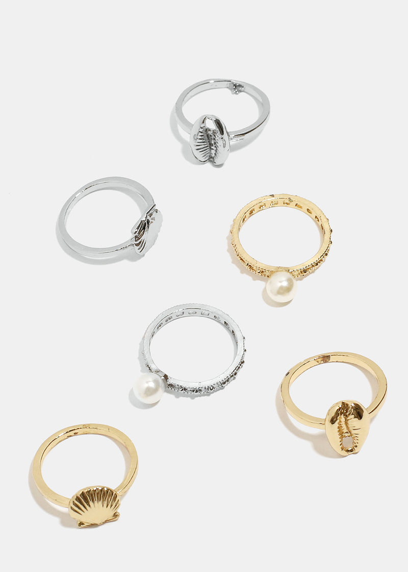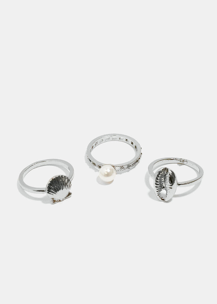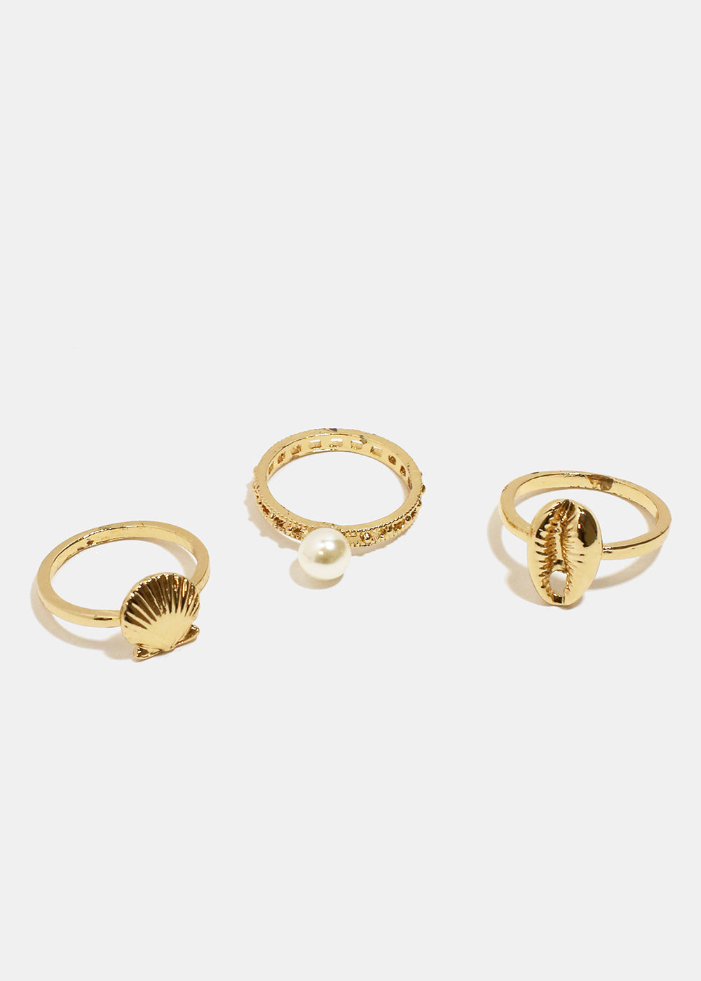 A 3-piece ring set featuring shell and pearl rings. A pretty addition to any look!