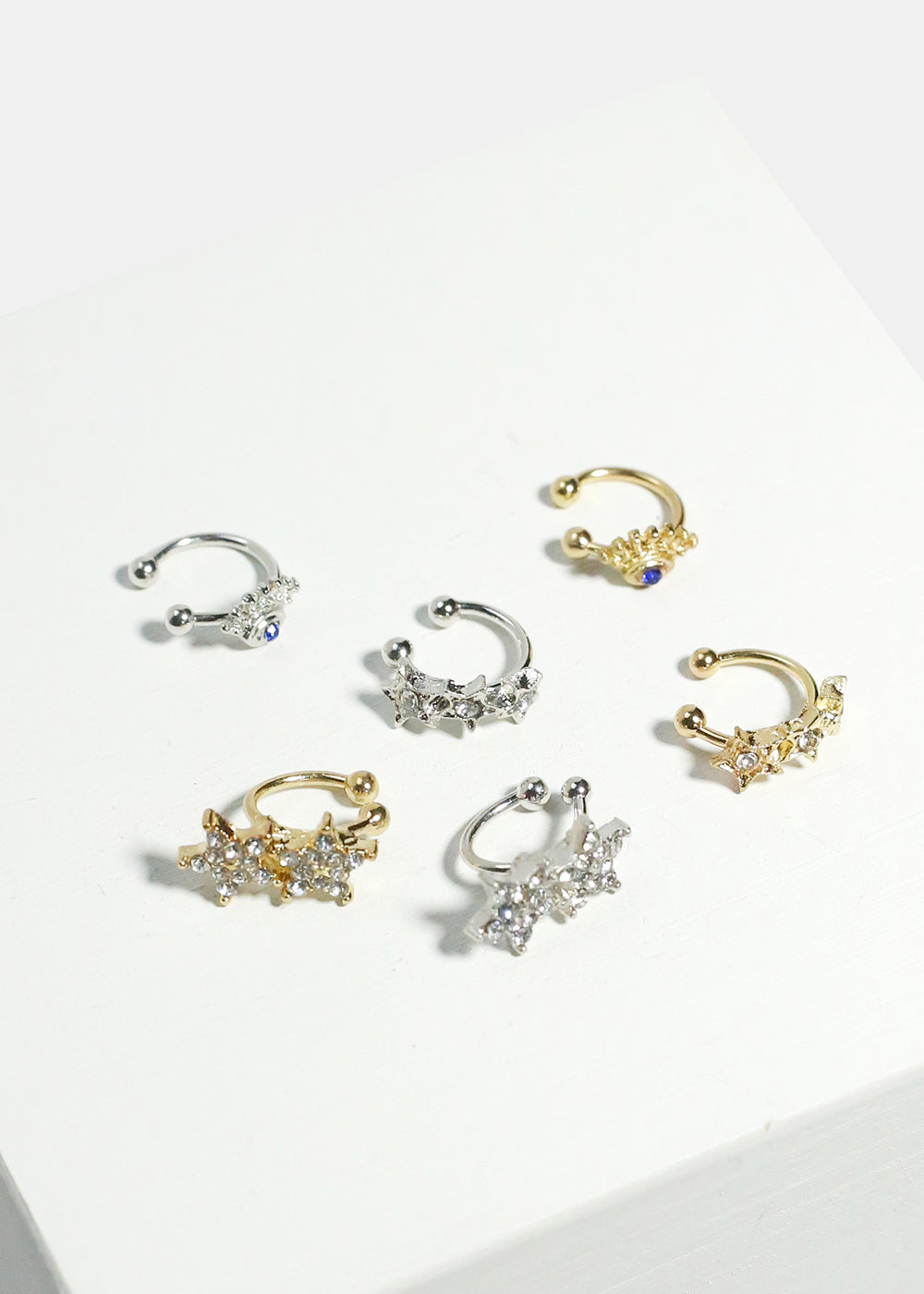 Change up your look with this 3-piece star and eye cuff earrings set. A unique and chic touch to your ensemble!