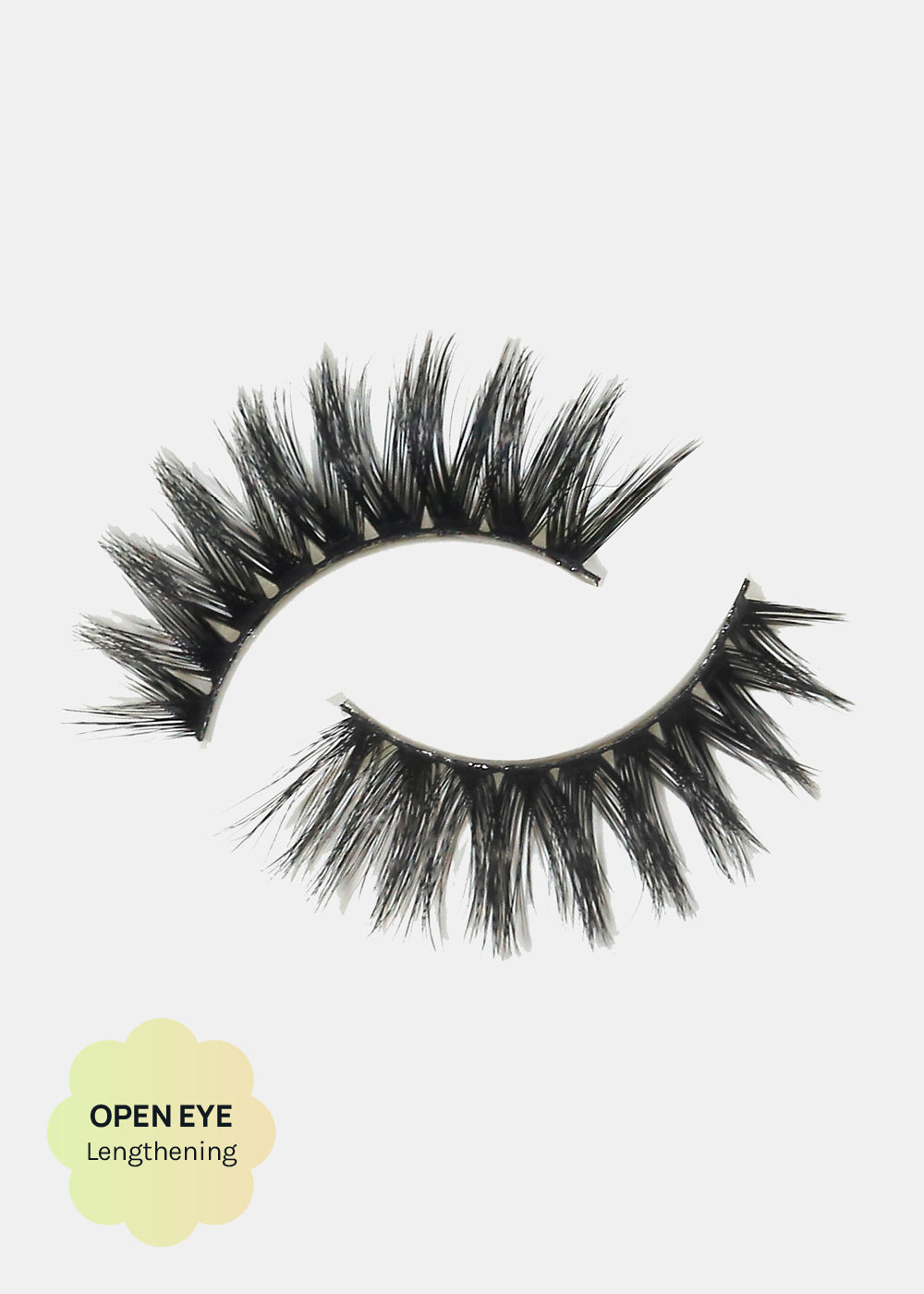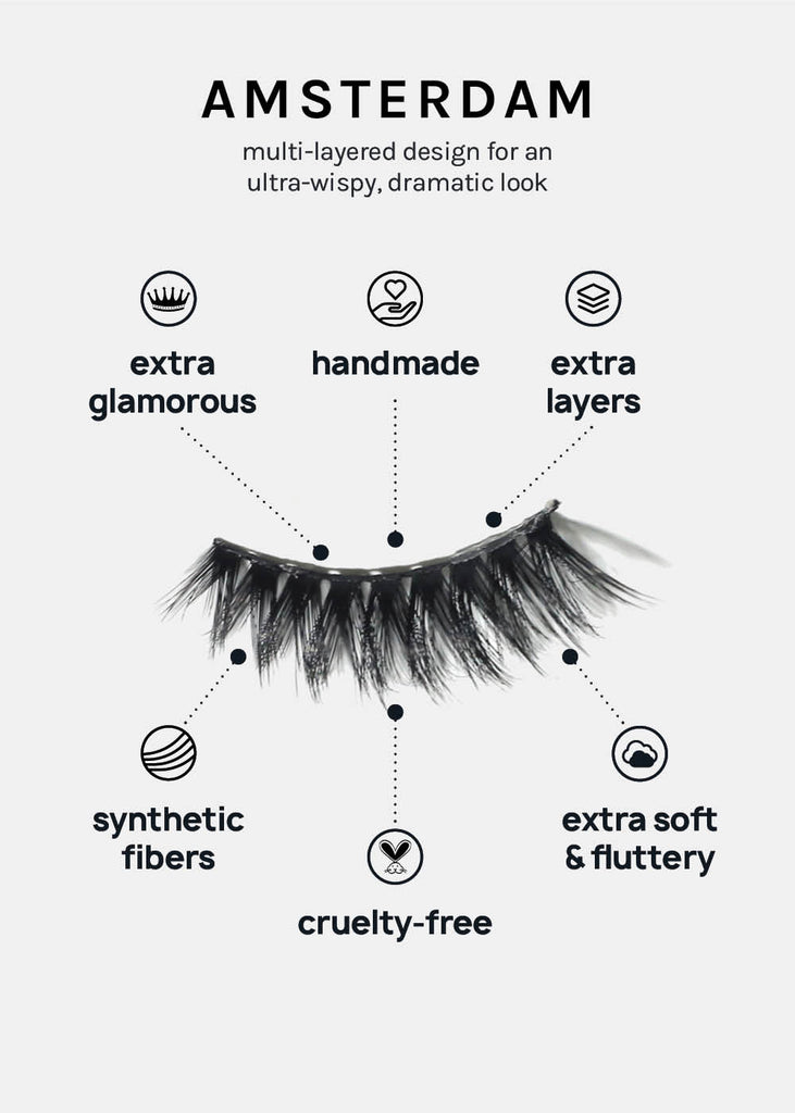 GLAM, super WISPY, + stacked, A+ Glam 3D Faux Mink Eyelashes are 100% Vegan fiber layered to add fluttery length + volume to all eye shapes. Features a wide lash band to last multiple wears.