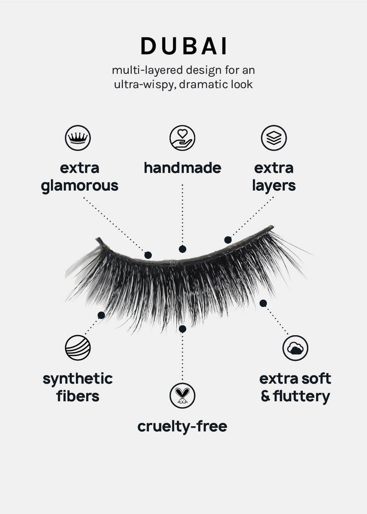 GLAM, super WISPY, + stacked, A+ Glam 3D Faux Mink Eyelashes are 100% Vegan fiber layered to add fluttery length + volume to all eye shapes. Features a wide lash band to last multiple wears.