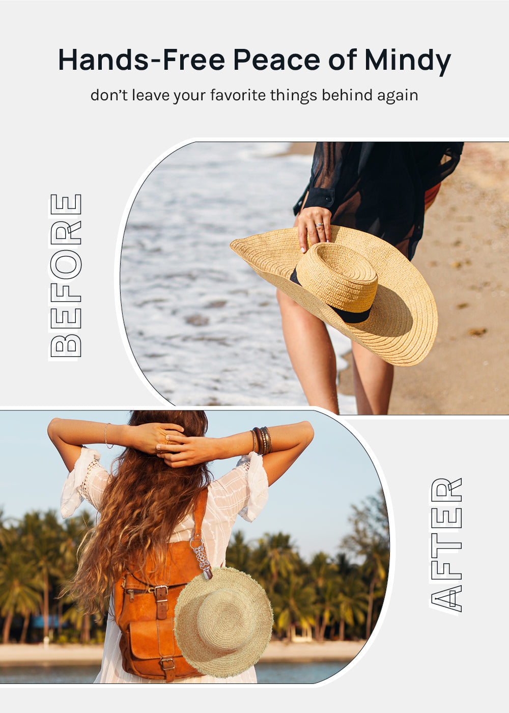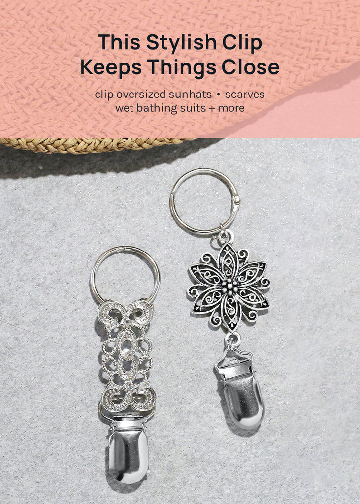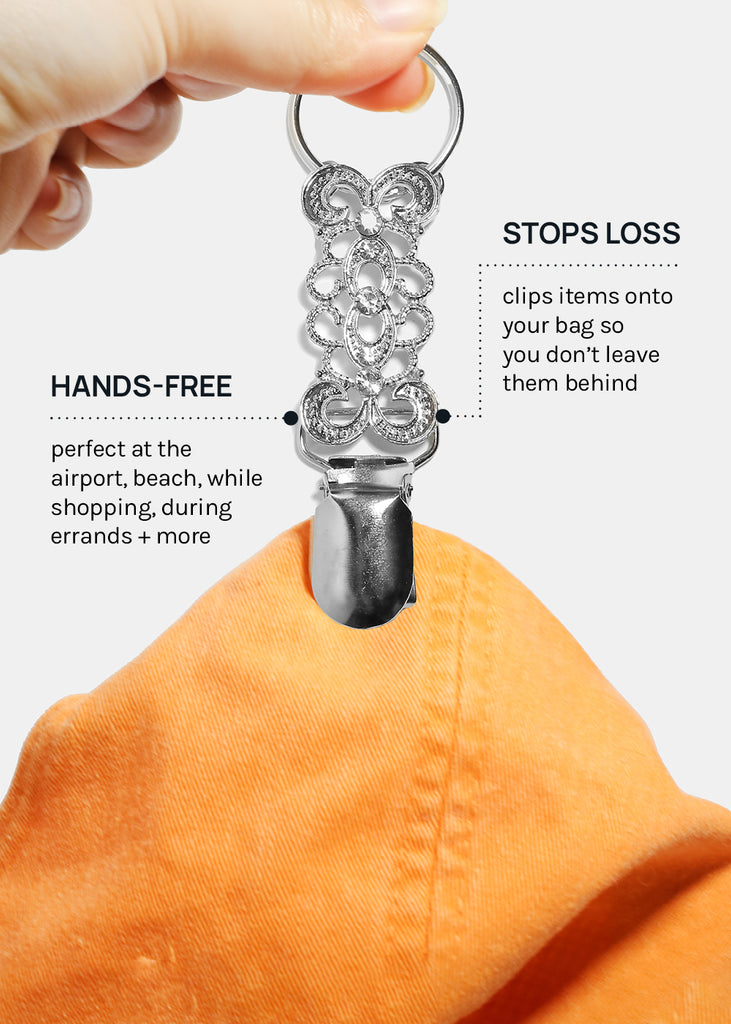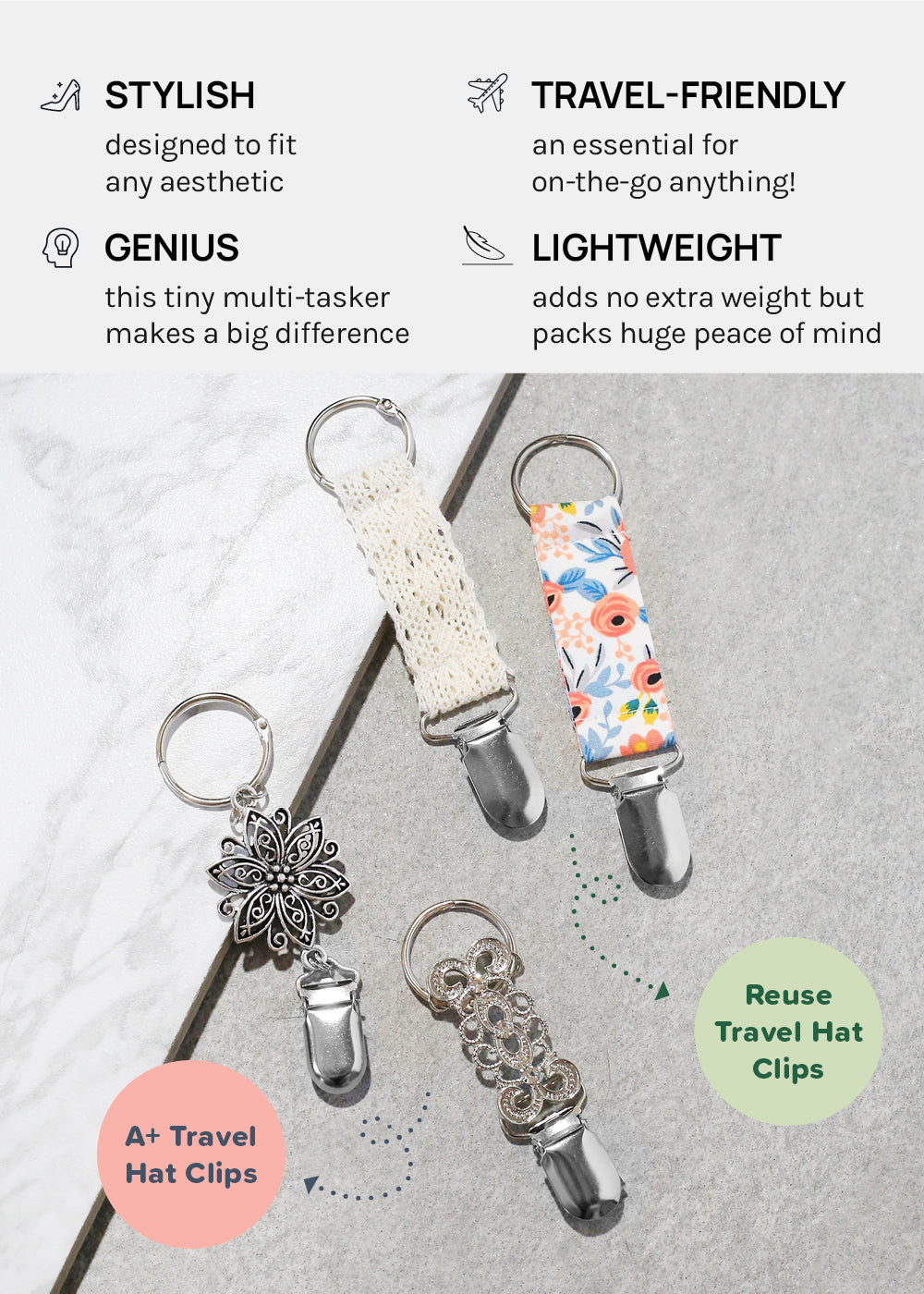 Keep hands free + accessories from being lost with our Hat Clip that attaches hats, gloves, + scarves to your tote bag, backpack, purse, + more. Our Hat Clip keeps items handy + ready to use while camping, running errands, traveling, + more. Great for train or ski lift tickets, hair bands, or anything else you want.