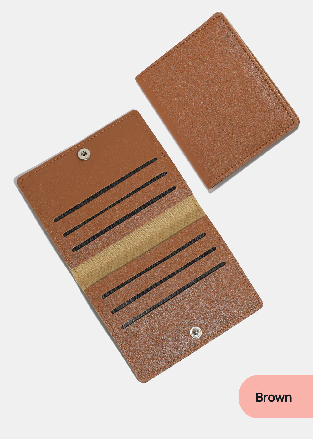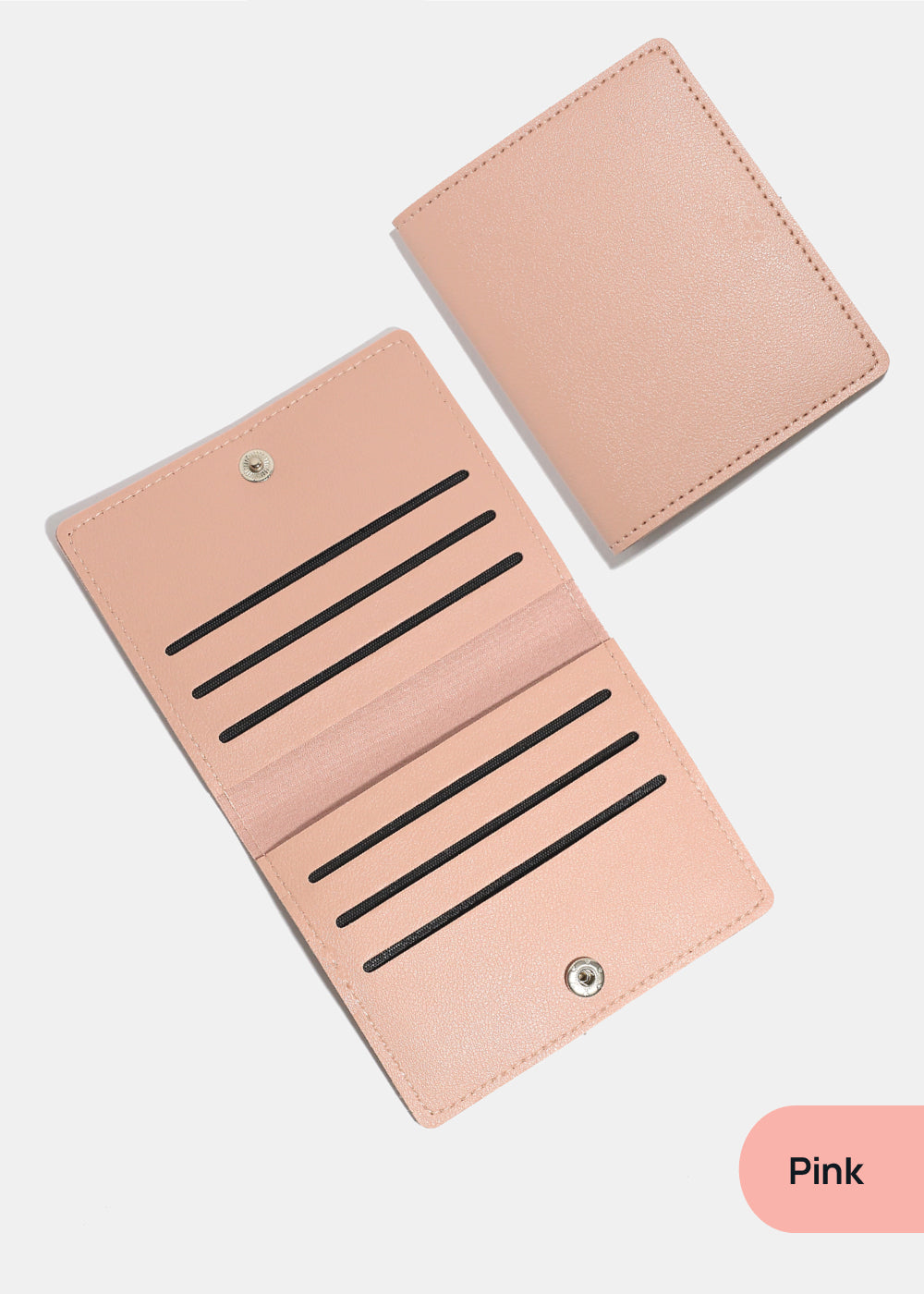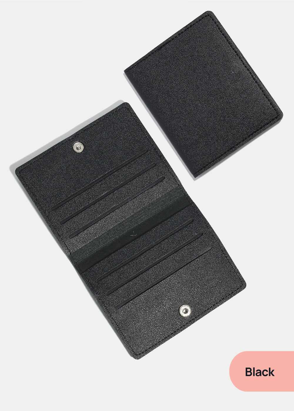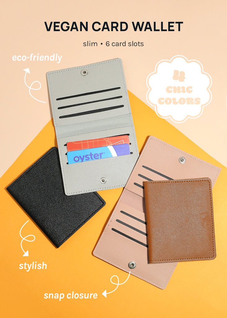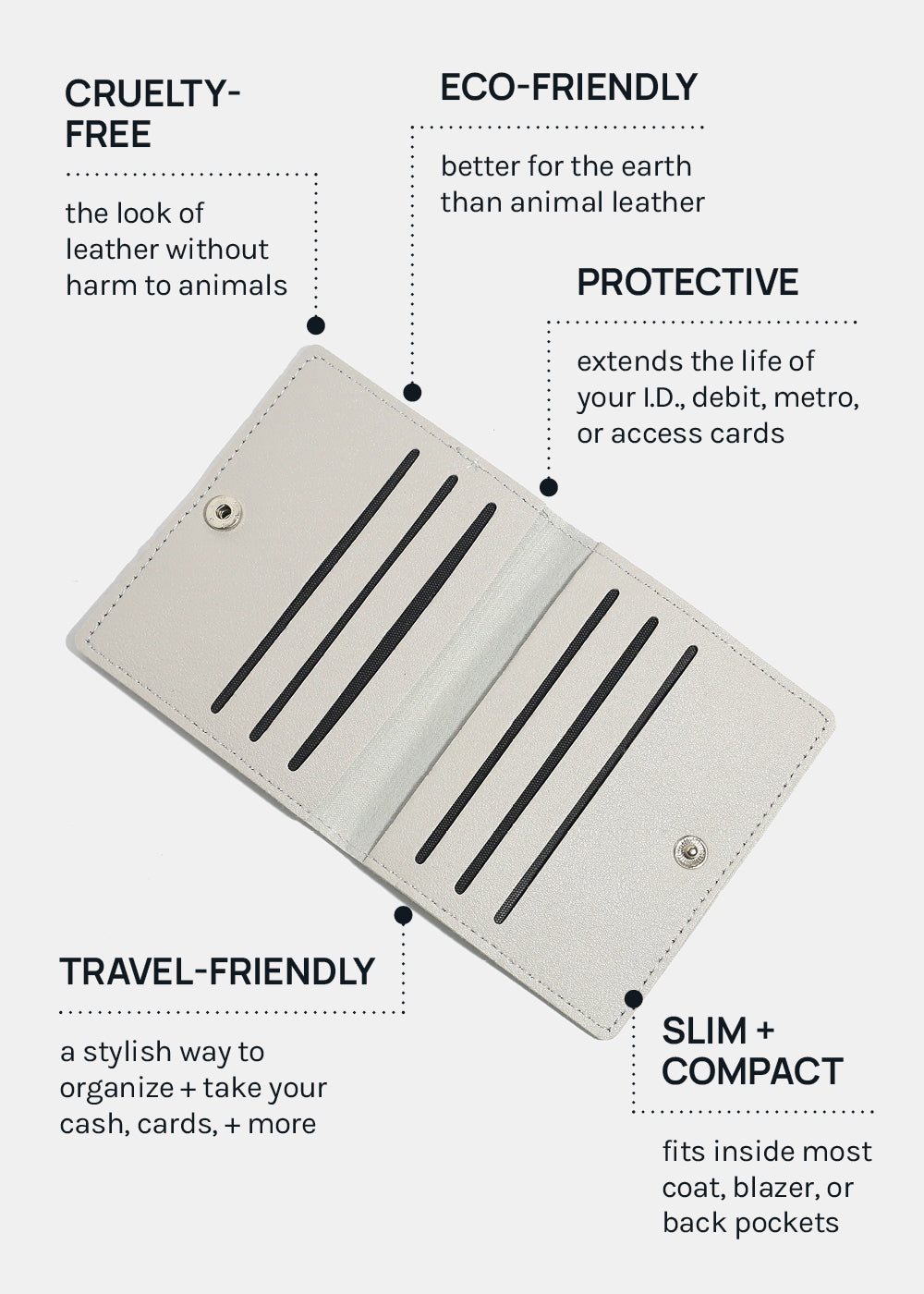 This handy Vegan Leather Card Holder is conveniently slim enough to fit most front + back pockets. Features multiple card slots to store ID + credit/debit cards, tickets, receipts, public transit passes, business cards, + more. Wipes clean.