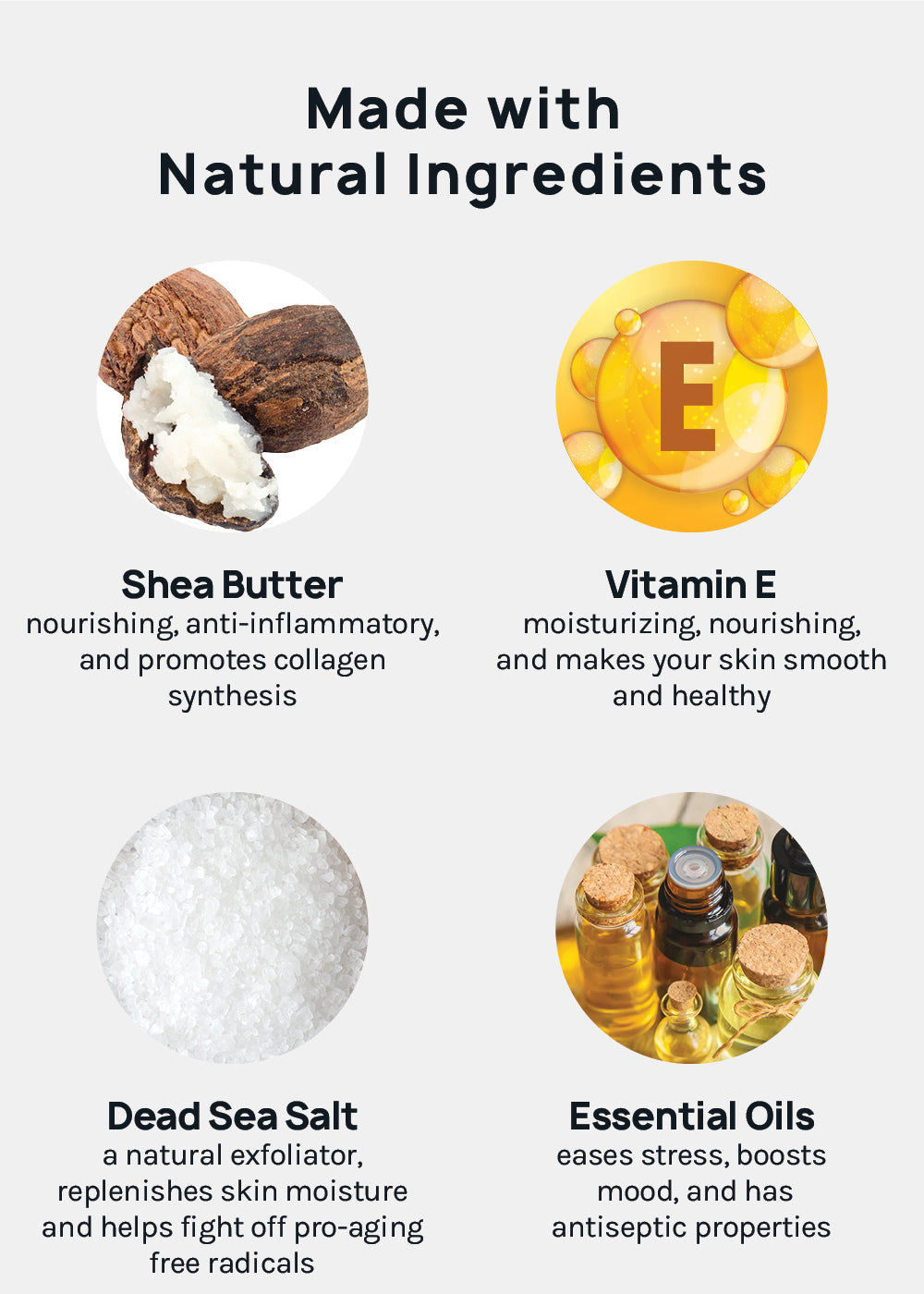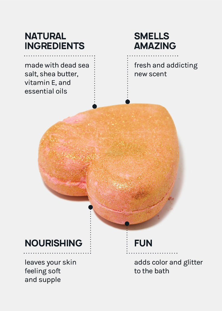 Baking Soda, Citric Acid, Dead Sea Salt, Water, Essential Oil, Shea Butter, Vitamin E, Berry Scent, Gold Mica