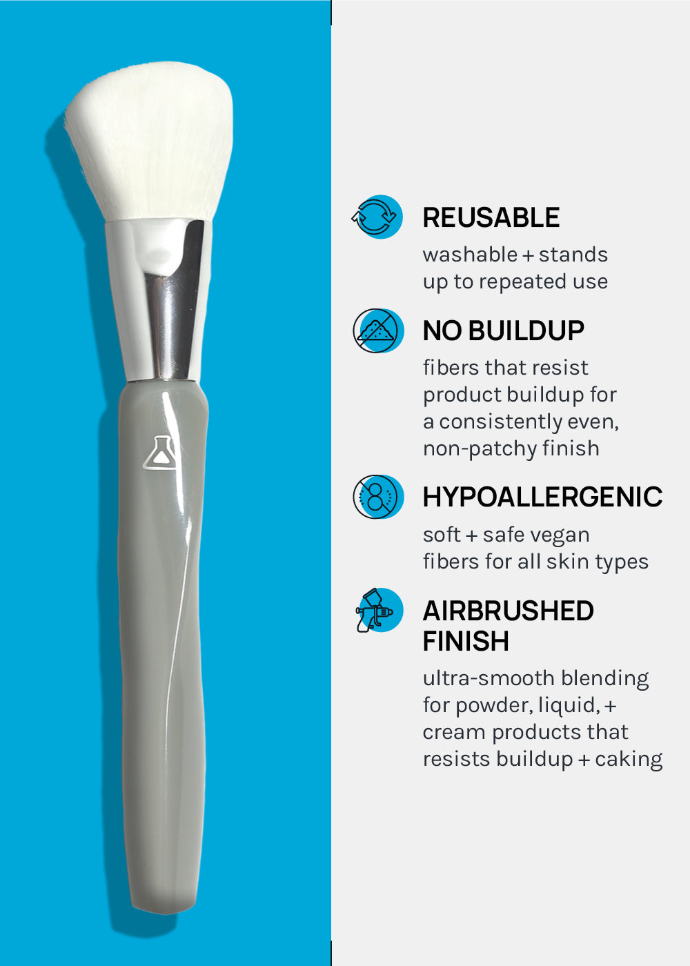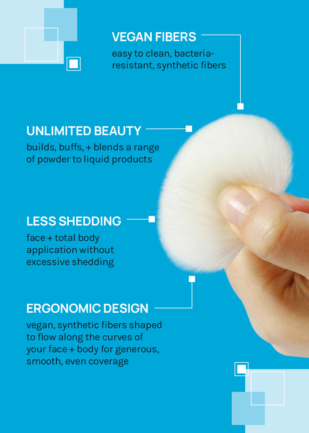 A powder makeup brush with vegan fibers for seamless application of setting powder, blush, body shimmer, + more. Versatile for going between foundation, powder, + blush without buildup.