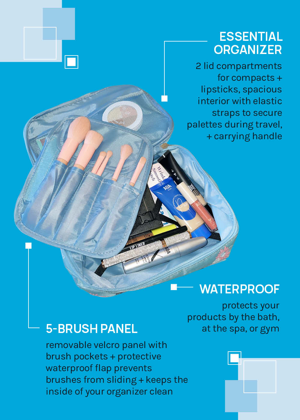 Stay effortlessly organized with this Floral Travel Vanity Case, designed for beauty lovers who need both function + flair. This chic travel makeup organizer is equipped with elastic straps to keep palettes securely in place, preventing shifting during travel. A removable velcro panel with multiple brush pockets + a protective waterproof flap ensures your brushes stay put while keeping the inside of your vanity case clean.
