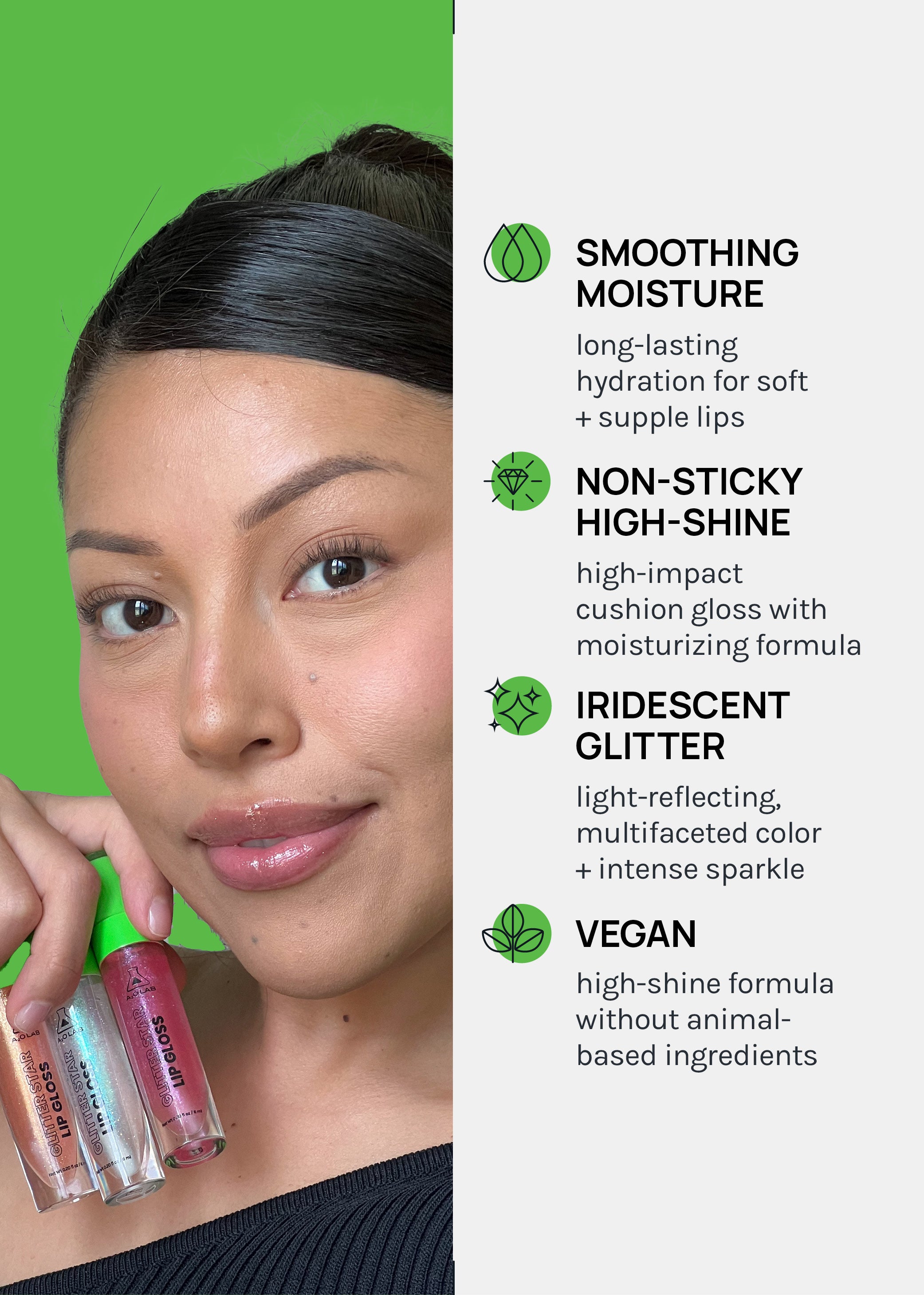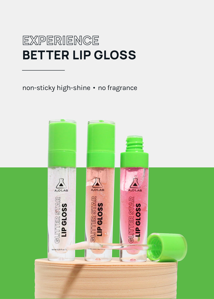 Test out a2o Lab's NEW lightweight, light-reflecting Glitter Star Lip Gloss! A non-sticky, high-shine lip gloss to make your lips look fuller.