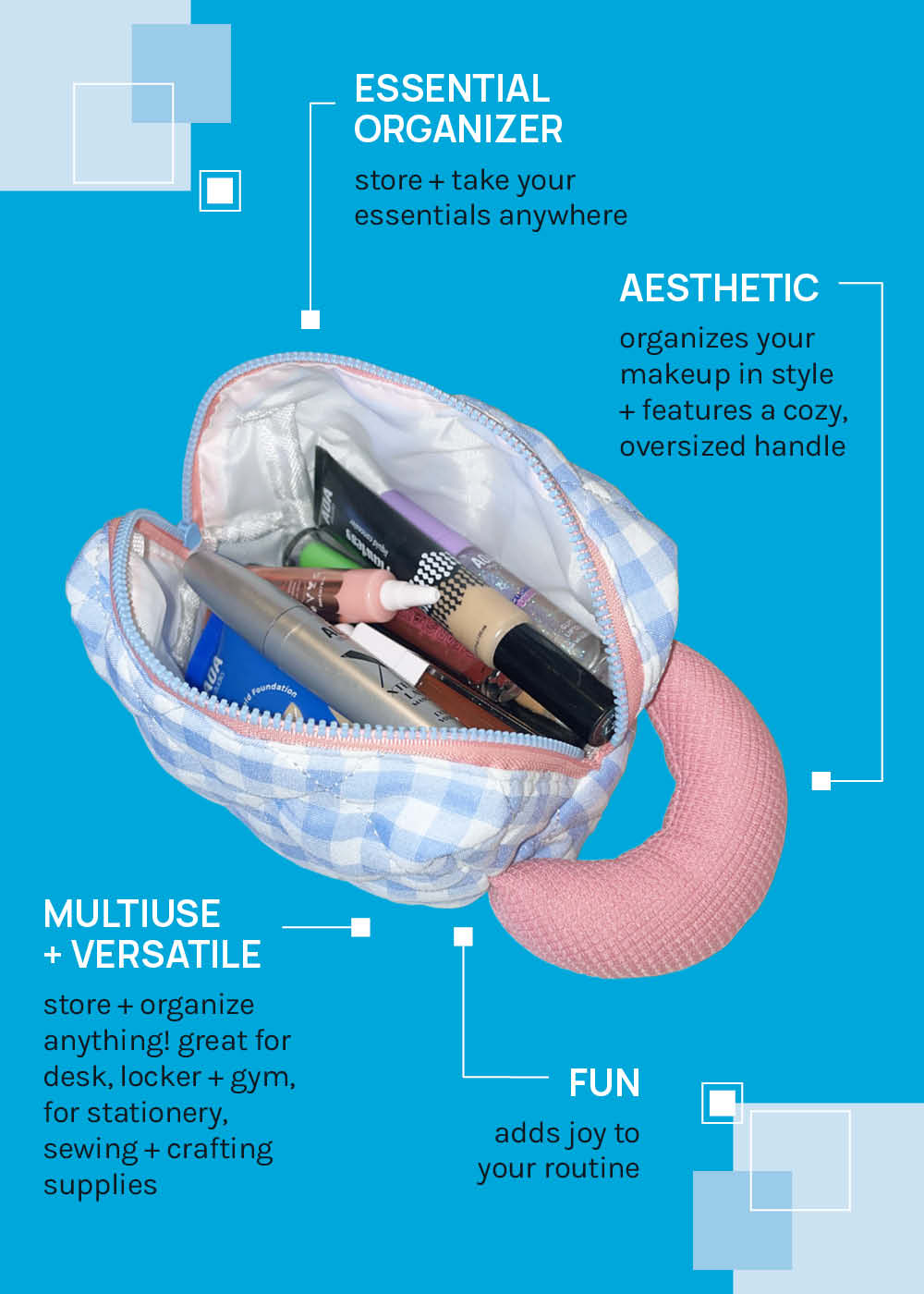 Upgrade your storage game with this Lightweight Makeup Pouch, designed for versatility + style. Featuring a charming plaid pattern in soft pastel hues, this quilted pouch is both stylish + durable. Its oversized plush handle adds a unique touch, making it easy to carry wherever you go.