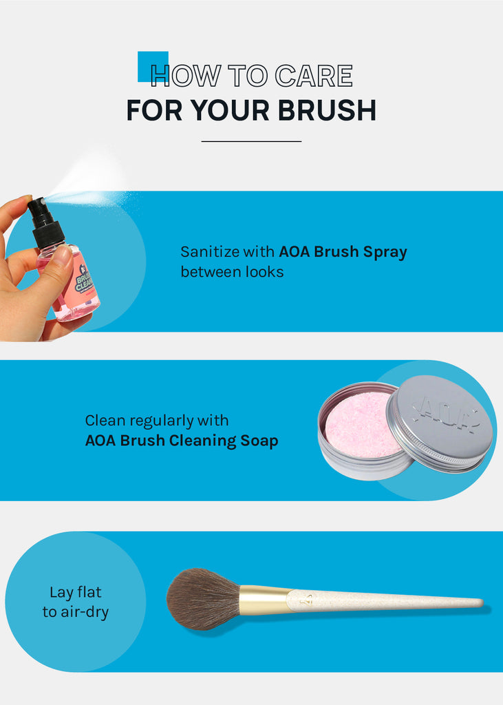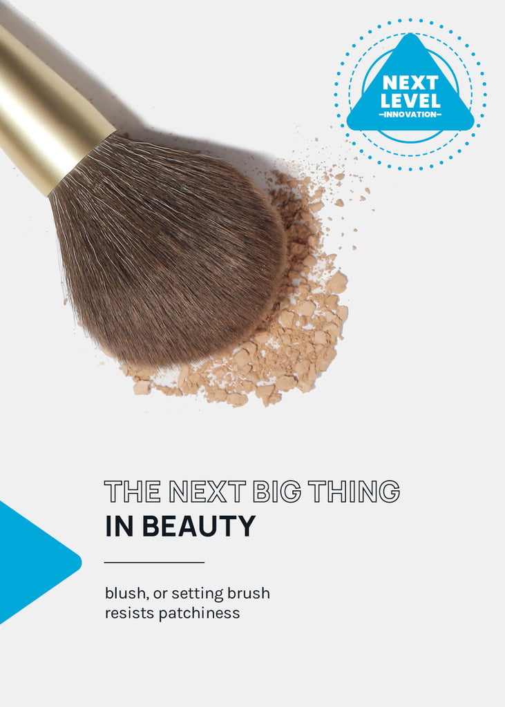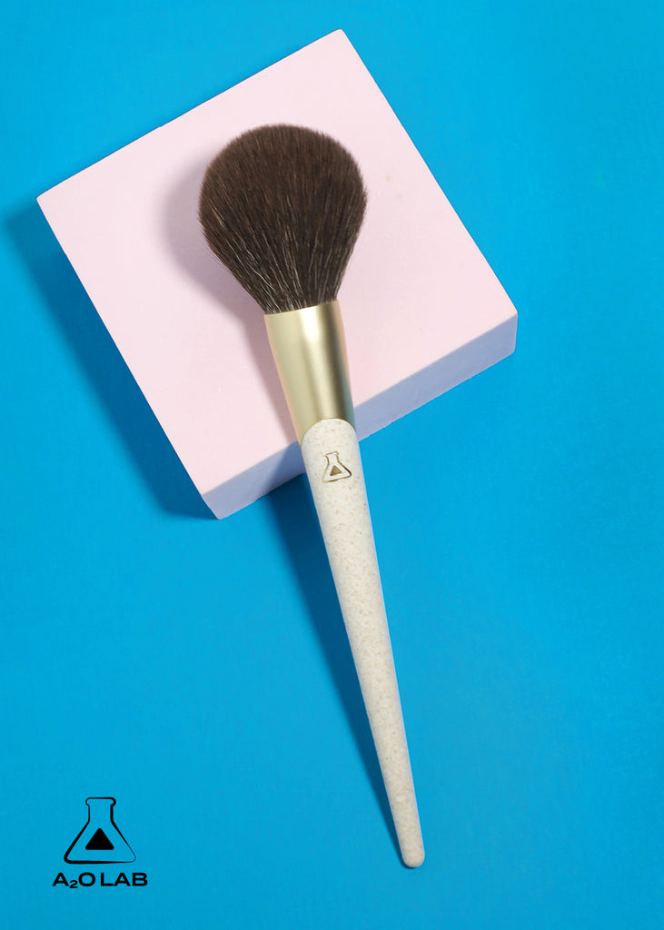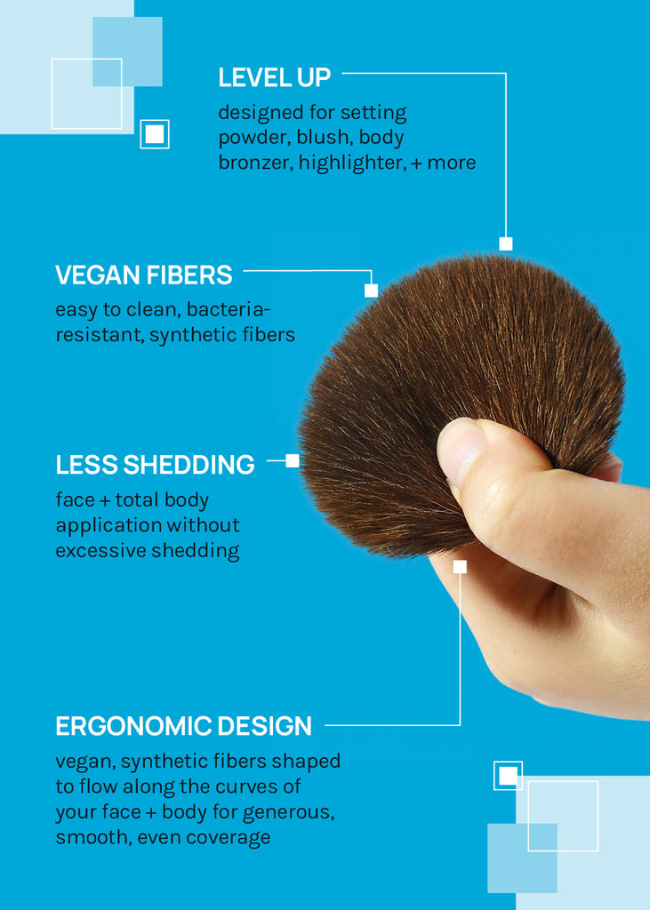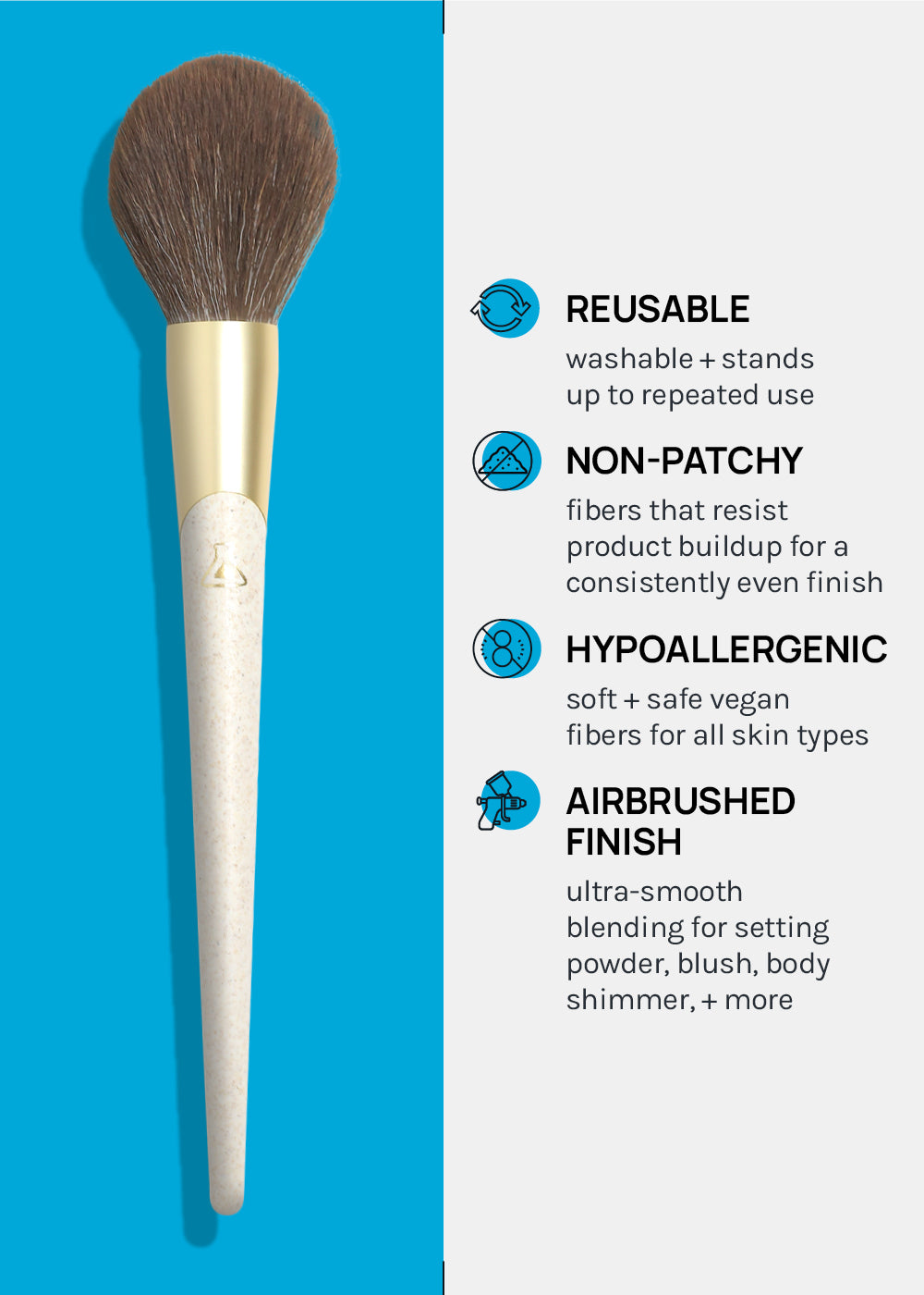 A powder makeup brush with vegan fibers for seamless application of setting powder, blush, body shimmer, + more. Versatile for going between foundation, powder, + blush without buildup.