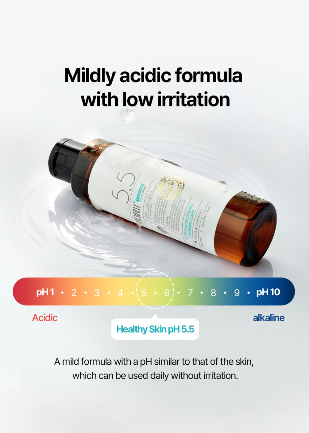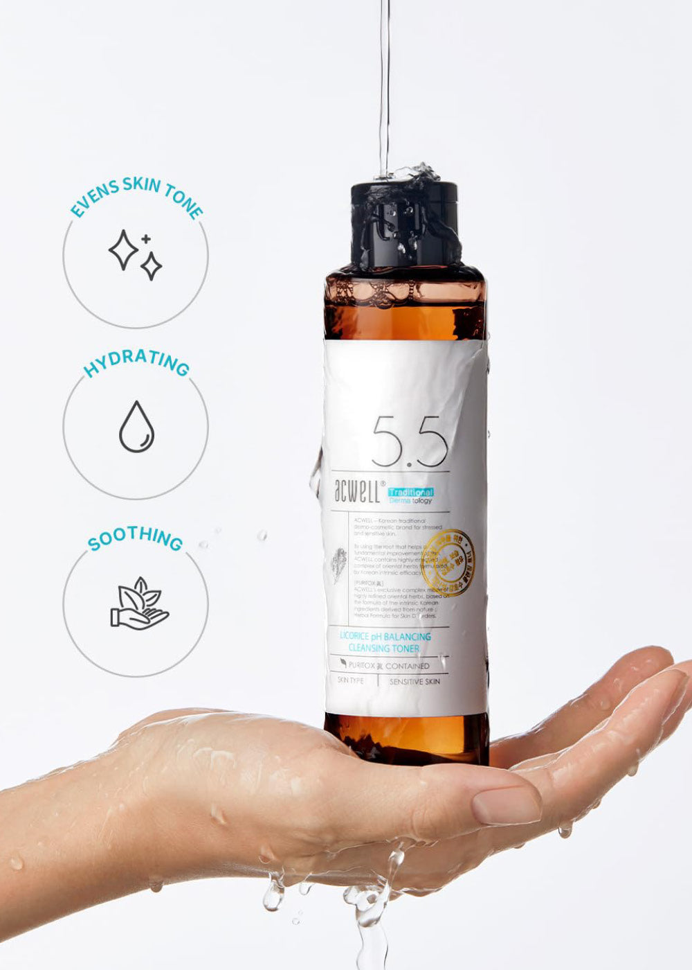 Acwell Licorice pH Balancing Korean Toner for Cleansing container roots of licorice and amino acid complex. This facial cleansing water for sensitive skin maintains a pH level of 5.5-6 that effectively cleanses the skin while regulating the oil & pH levels.