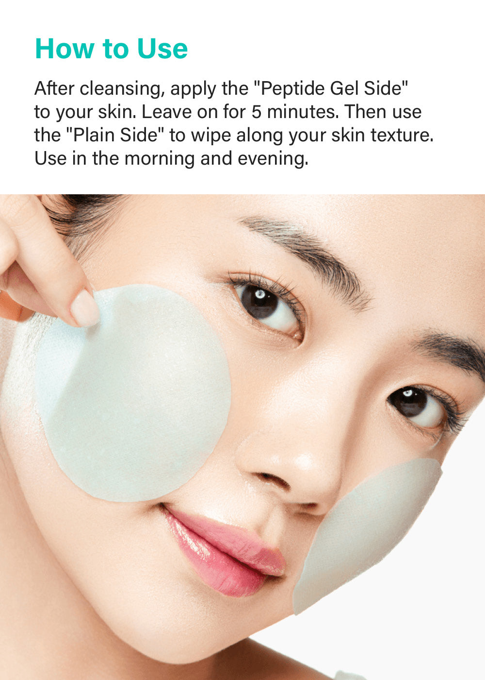 After cleansing, apply the peptide gel side to your skin and leave it on for five minutes like a mini sheet mask. Then, use the plain side to gently wipe along your skin texture and lightly pat in the remaining essence. Suitable for daily use, both morning and night. For a quick boost, try it as a morning mask while drying your hair.