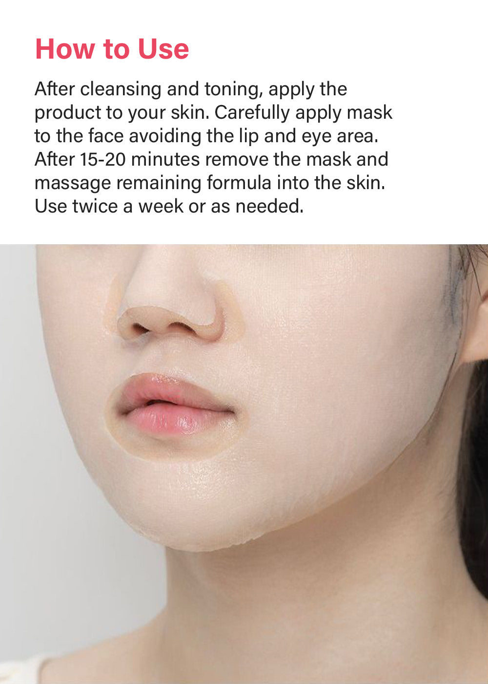 - Leave on for 10-20 minutes, remove the mask and pat lightly to aid absorption of the remaining content.