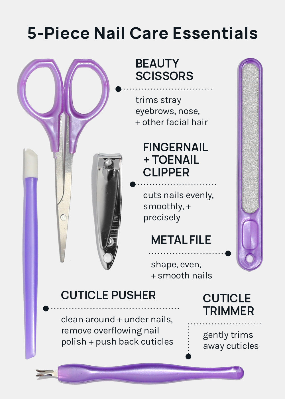- Fingernail + Toenail Clipper: cuts nails evenly, smoothly, + precisely.
