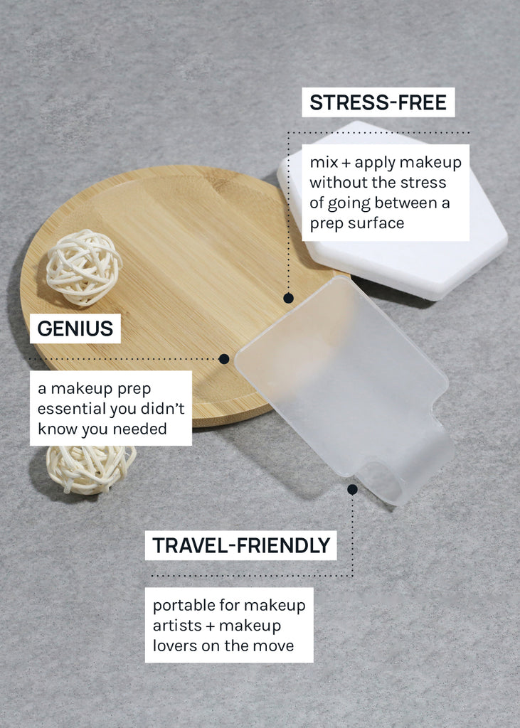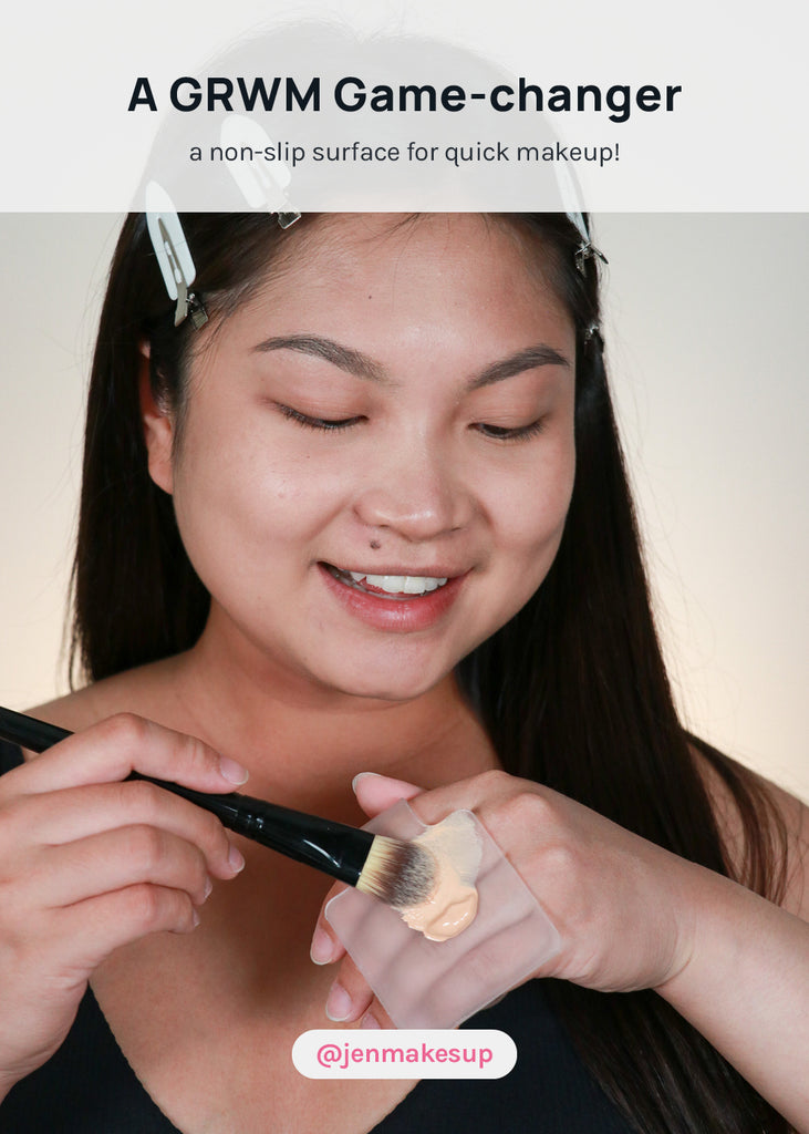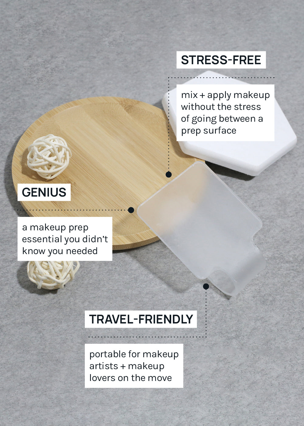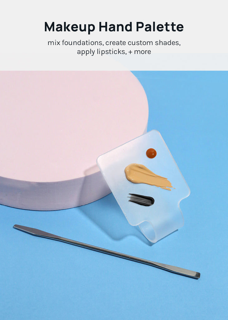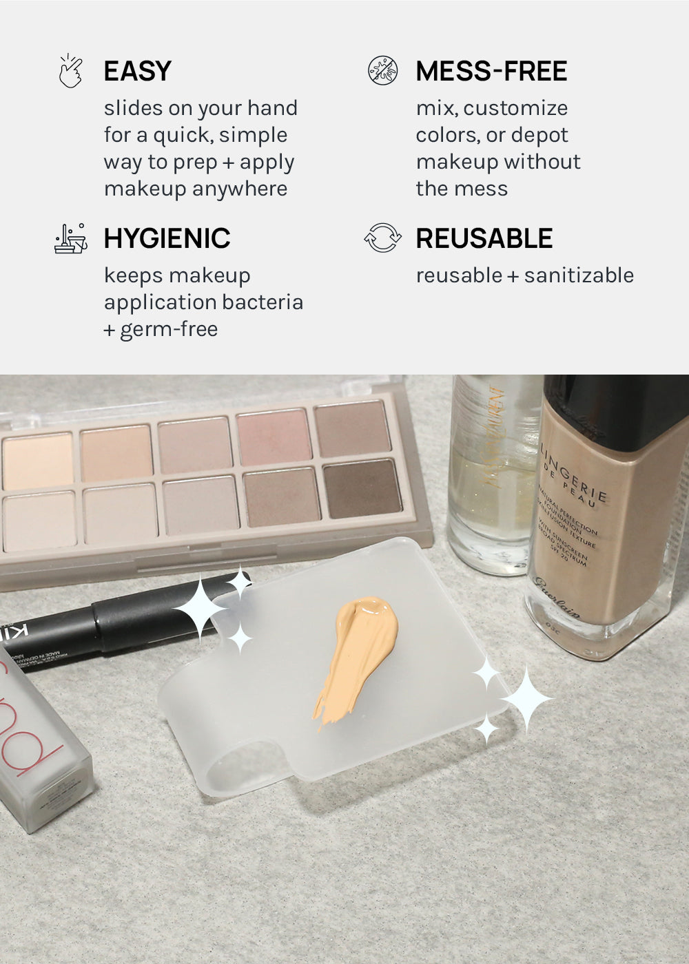 This tool slips securely onto your hand, creating a surface to pump foundation or other creamy or liquid color cosmetics onto for quick application, keeping your hands clean. Sanitize with soap + water.