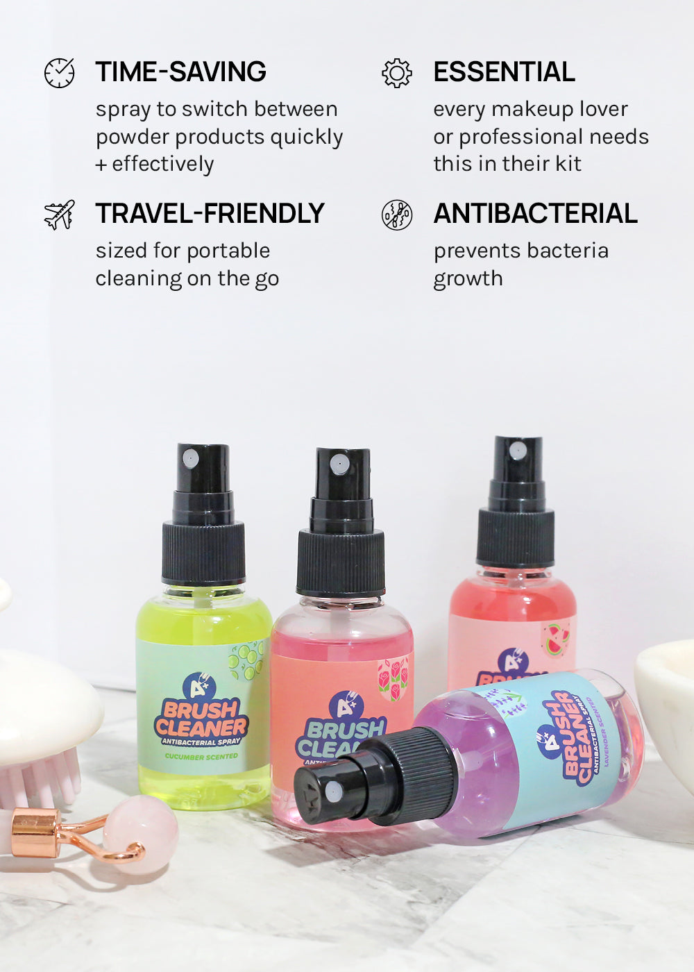 A Brush cleaning spray that will quickly remove powder color from your makeup brushes and also disinfect! Clean makeup brushes are a must for good hygiene and to protect your skin! Available in 2 refreshing scents! This is perfect to use in between makeup looks when you need to switch colors on your brush!