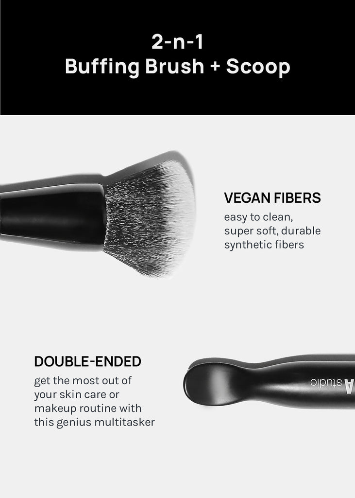 Apply + buff out primer putty, + makeup balms: This 2-n-1 Buffing Brush + Scoop is designed to pick up + buff out products.