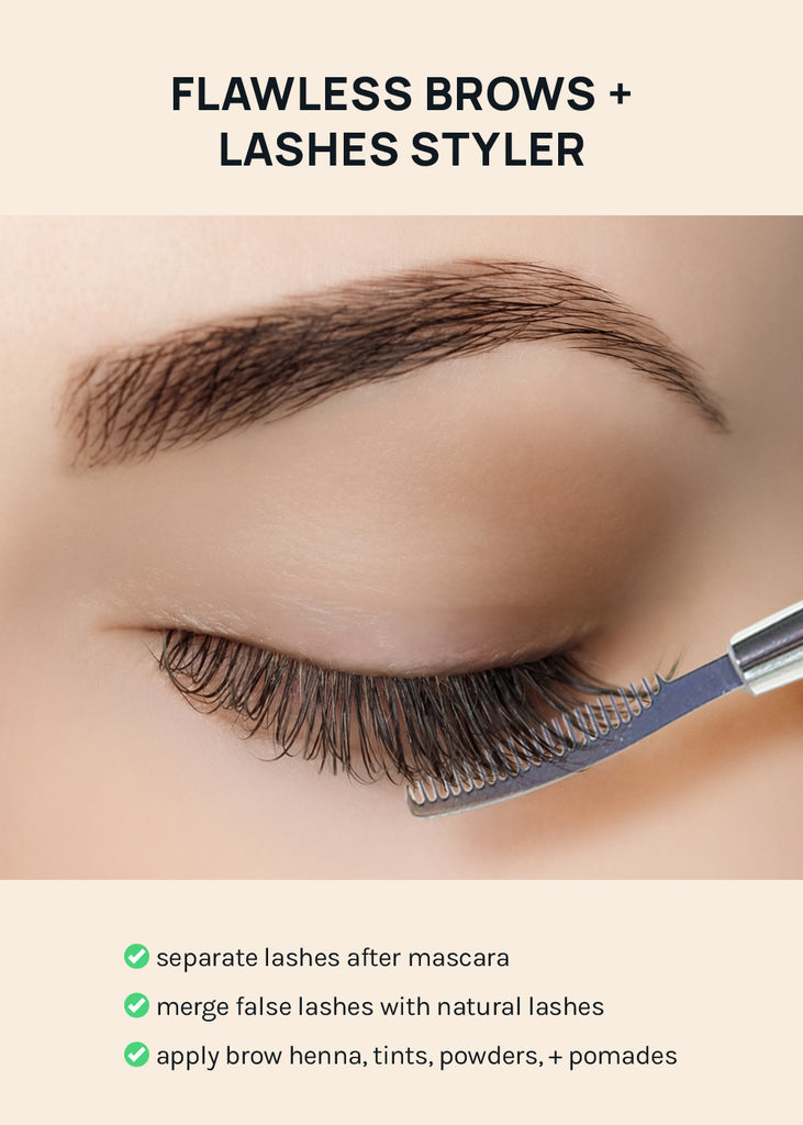 Use the metal comb to separate + groom brow hairs in place for long-lasting hold that lasts all day or night.