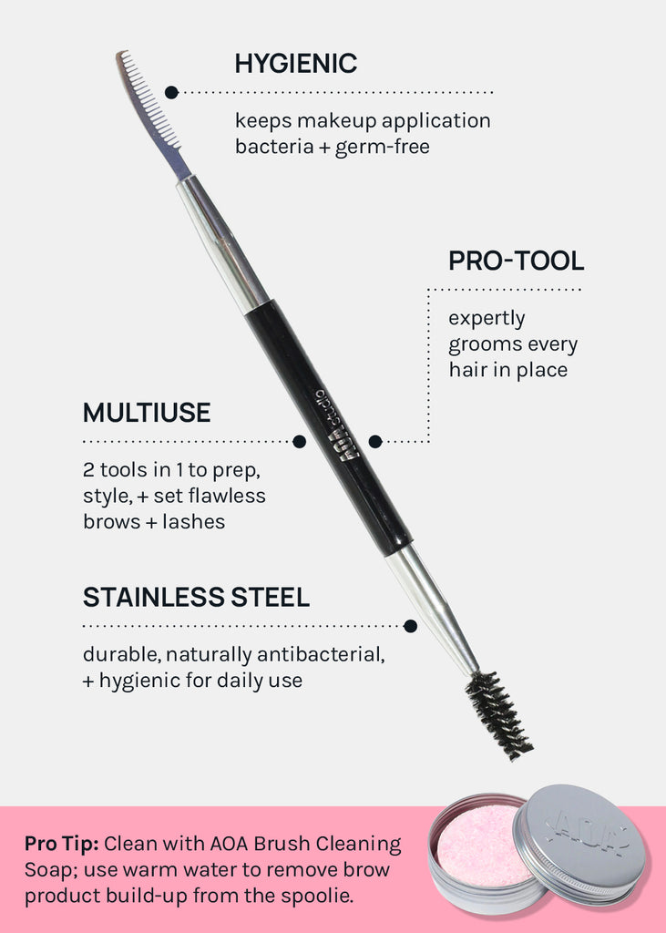 Pro Tip: Clean regularly with AOA Brush Cleaning Soap; use warm water to remove waxes + pomades from the spoolie brush.