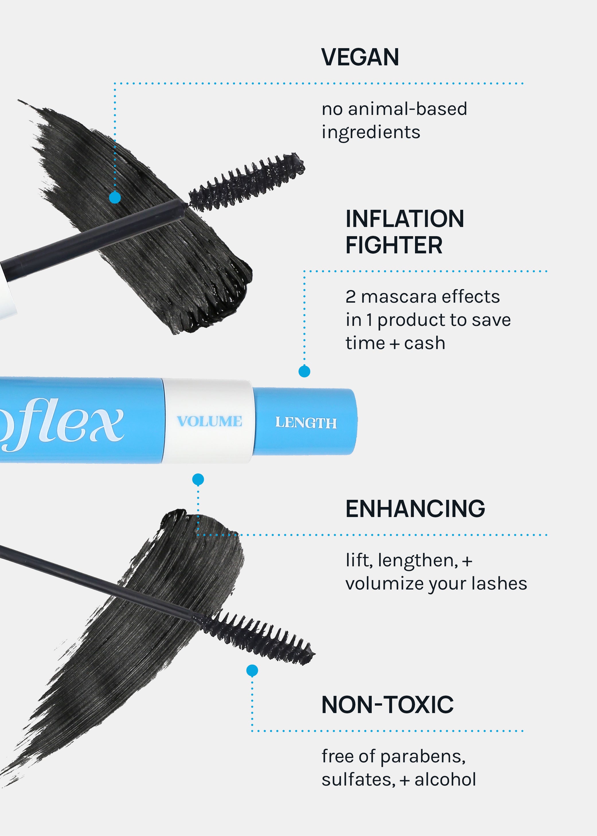 Lengthening + defining vegan mascara with 2 effects! PULL to remove excess mascara for lengthening definition, + PUSH to add mascara for buildable, thickening length.