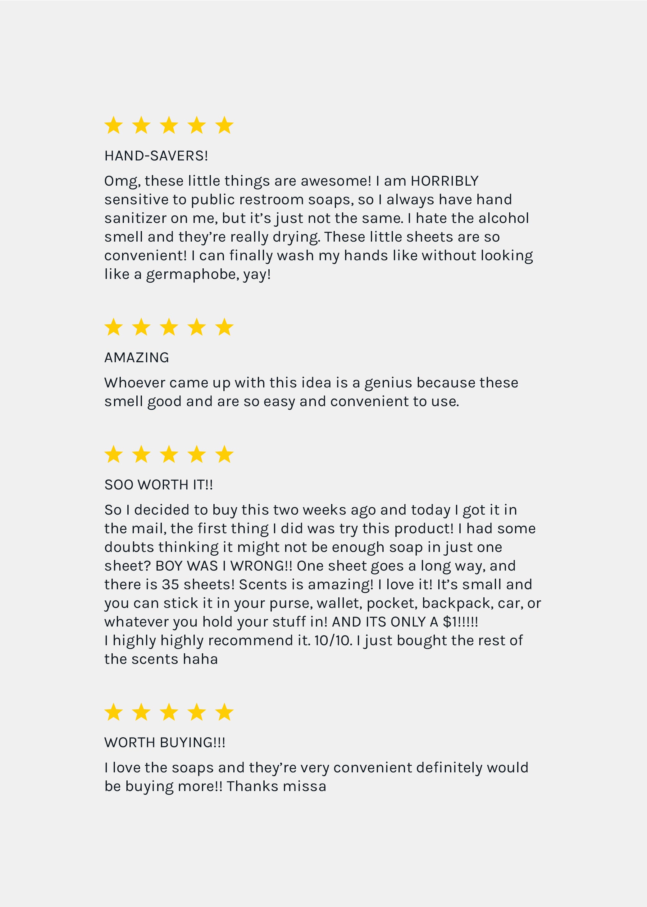 These anti-bacterial hand soap sheets are perfect for travel and your makeup bag! Whenever you need to wash your hands just take one of these out and wet with water and lather! They are convenient to take on the plane, while camping, hiking etc! The scents are also amazing!!