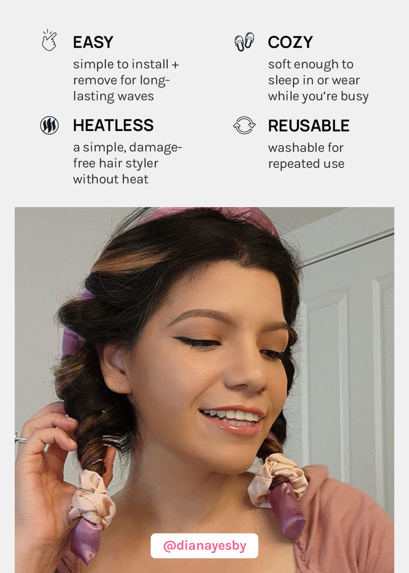 Frizz-free, perfect waves, + curls for all hair types! No matter your style, add heat + damage-free volume to your hair while you sleep, do chores, run errands + more!