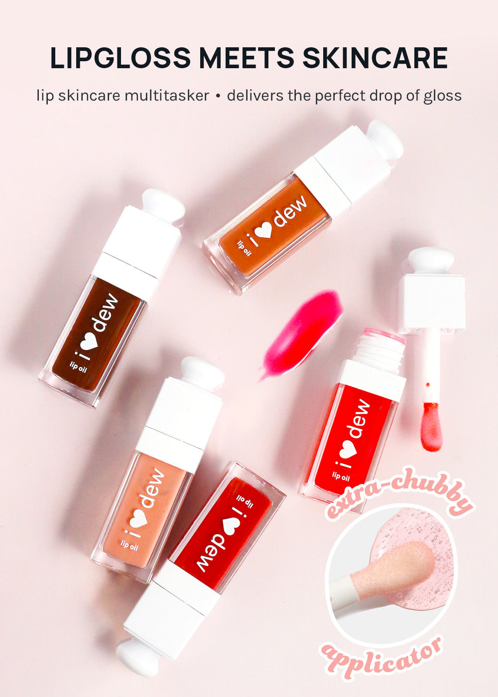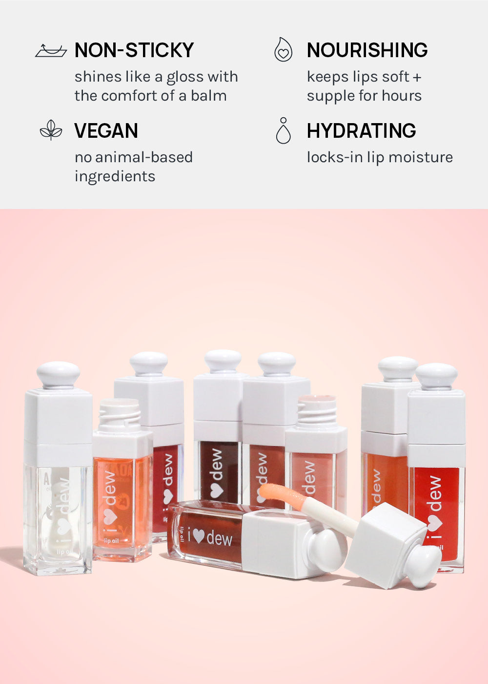 Fall in love with shine that truly cares! I Heart Dew Lip Oil is your go-to nourishing lip gloss-oil hybrid designed to soften, hydrate, + protect lips from dehydration and chapping. Each swipe delivers a comforting dollop of glossy moisture for a plush, healthy-looking finish.