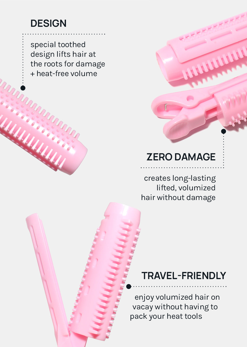 Add instant volume to your roots. The toothed design lifts hair at the roots for damage + heat-free volume. Simply clip into the top of damp hair to add volume.