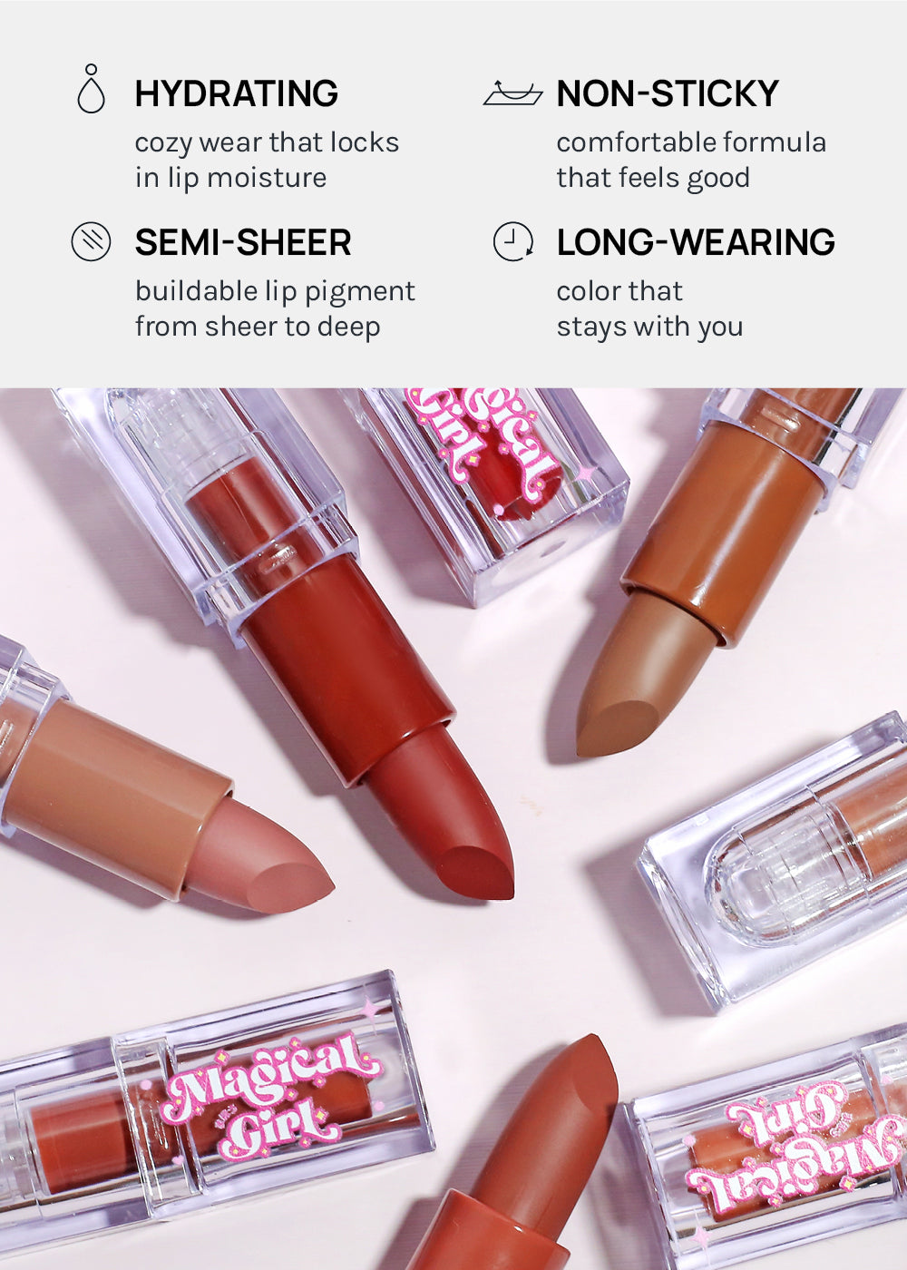 Release your inner Magical Girl with these 8 transformational skin-tone enhancing lipstick shades for the satin lip effect you want. Creamy + non-drying, comfortable finish that feels as magical as your vibe.
