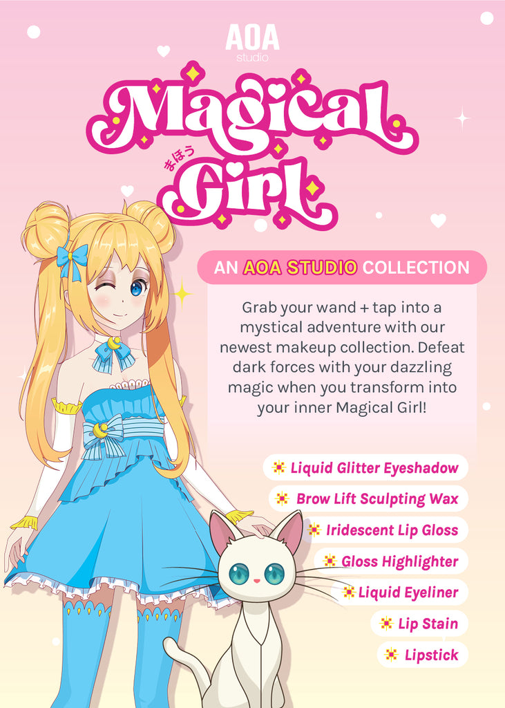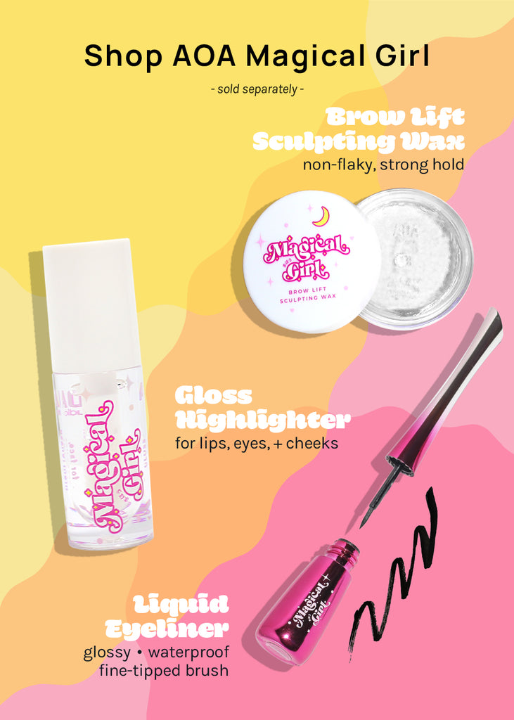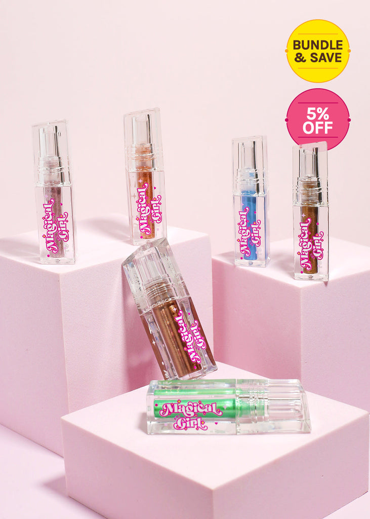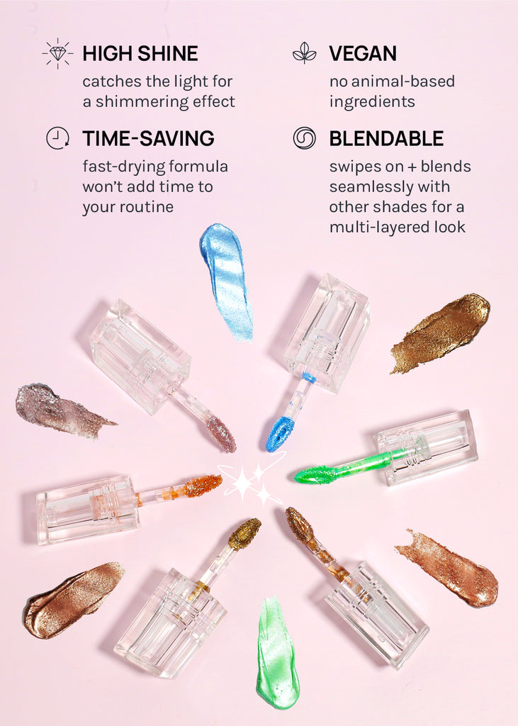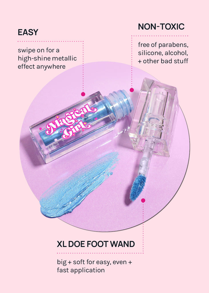 Transform your eyes to catch the light + release Your Inner Magical Girl everywhere you look: add reflective shimmer to your eyelids in vegan, non-flaking, + long-wearing, formulas. Create a metallic eye look in 1 swipe OR add reflective shine anywhere: topper for lips, highlight cheekbones, inner eye corners.