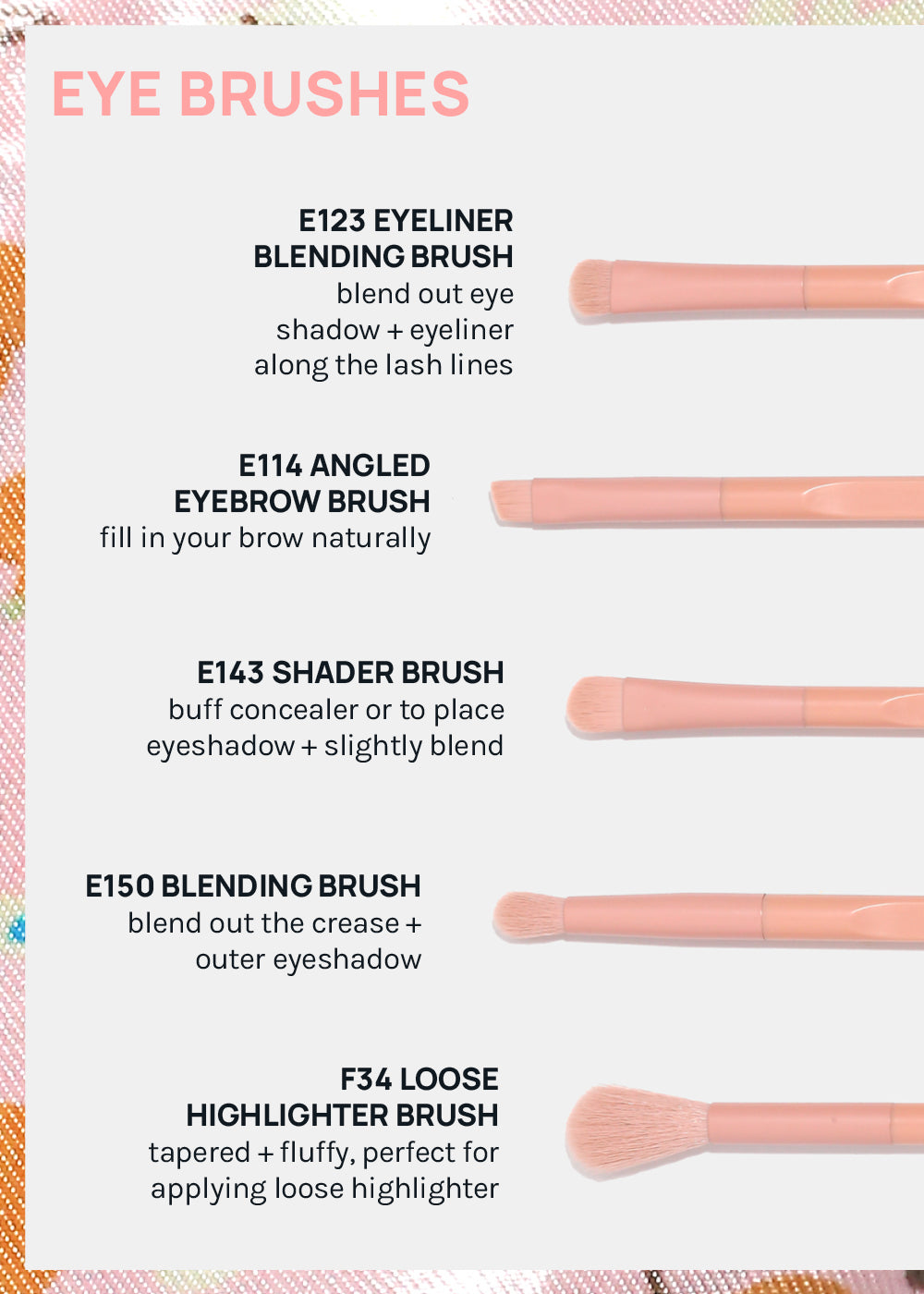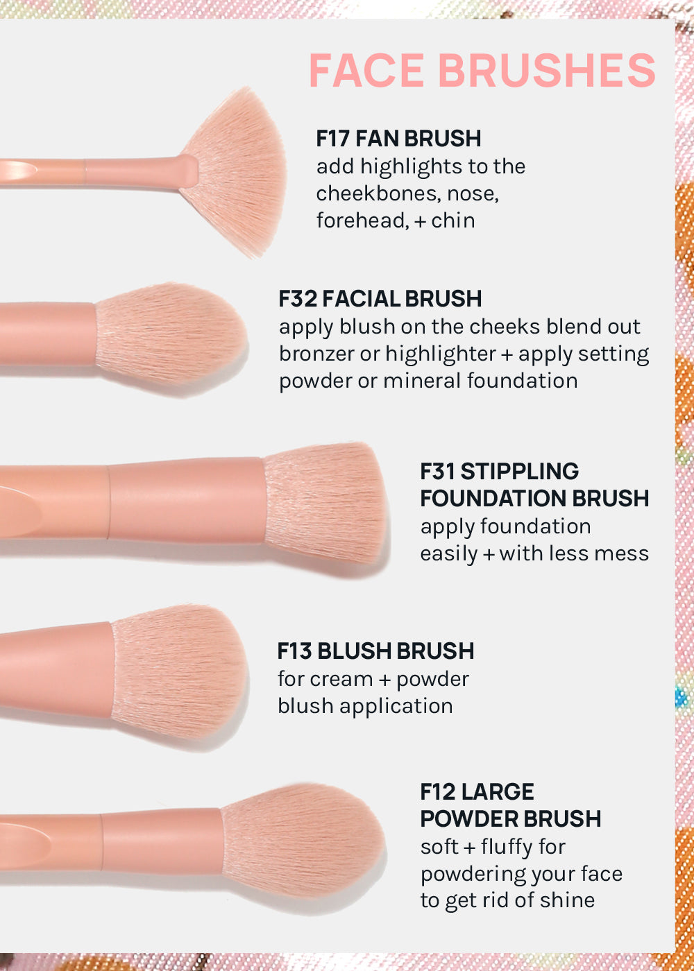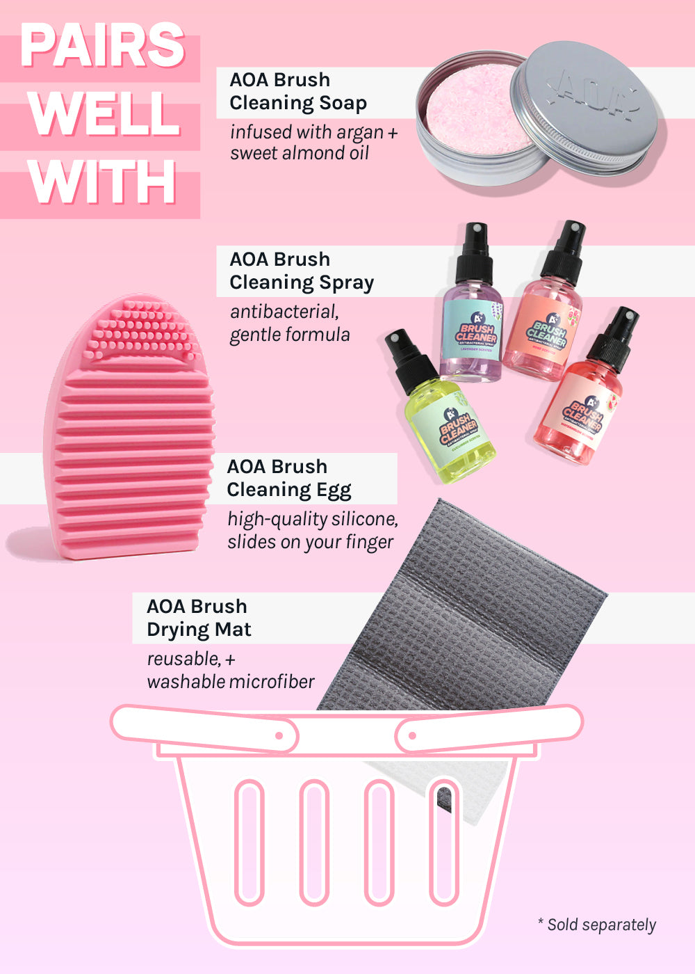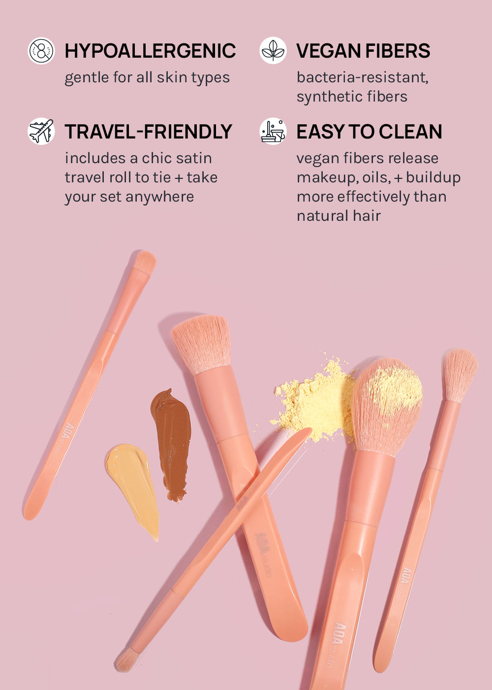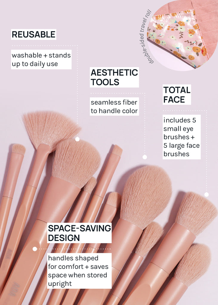 The latest drop from our makeup brush vault: super soft, cruelty-free, vegan brushes in muted matte pink from bristle to handle with a cute travel roll case so you can tie + take your set anywhere.