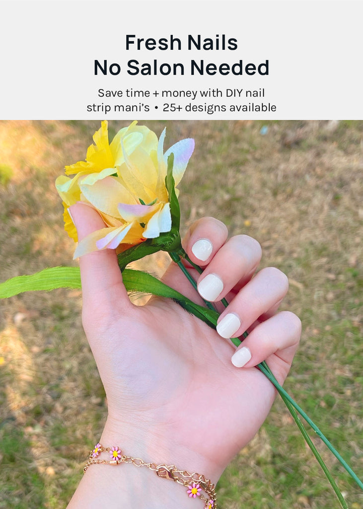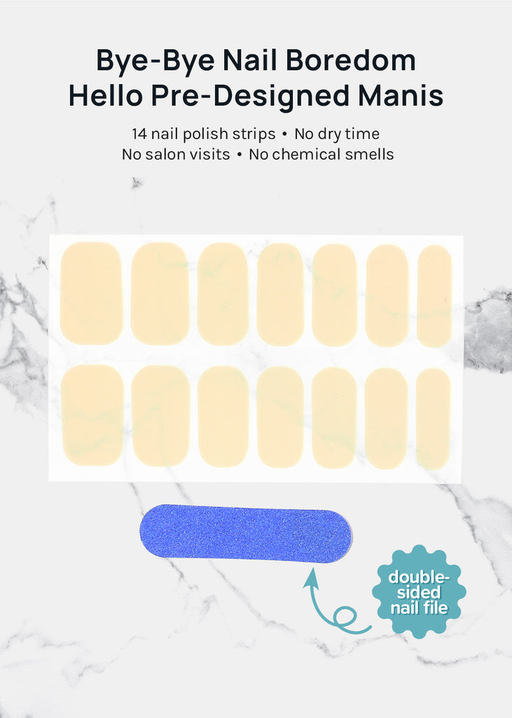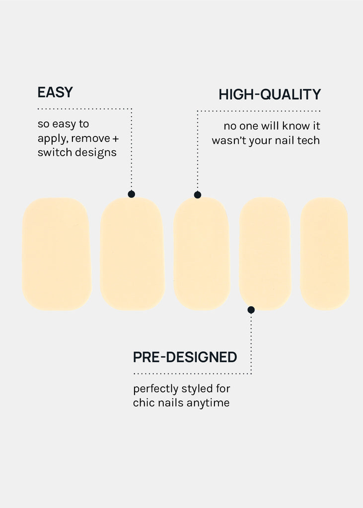 Bye-bye drying time! Create a perfect mani in minutes – just peel, stick, press + file!
