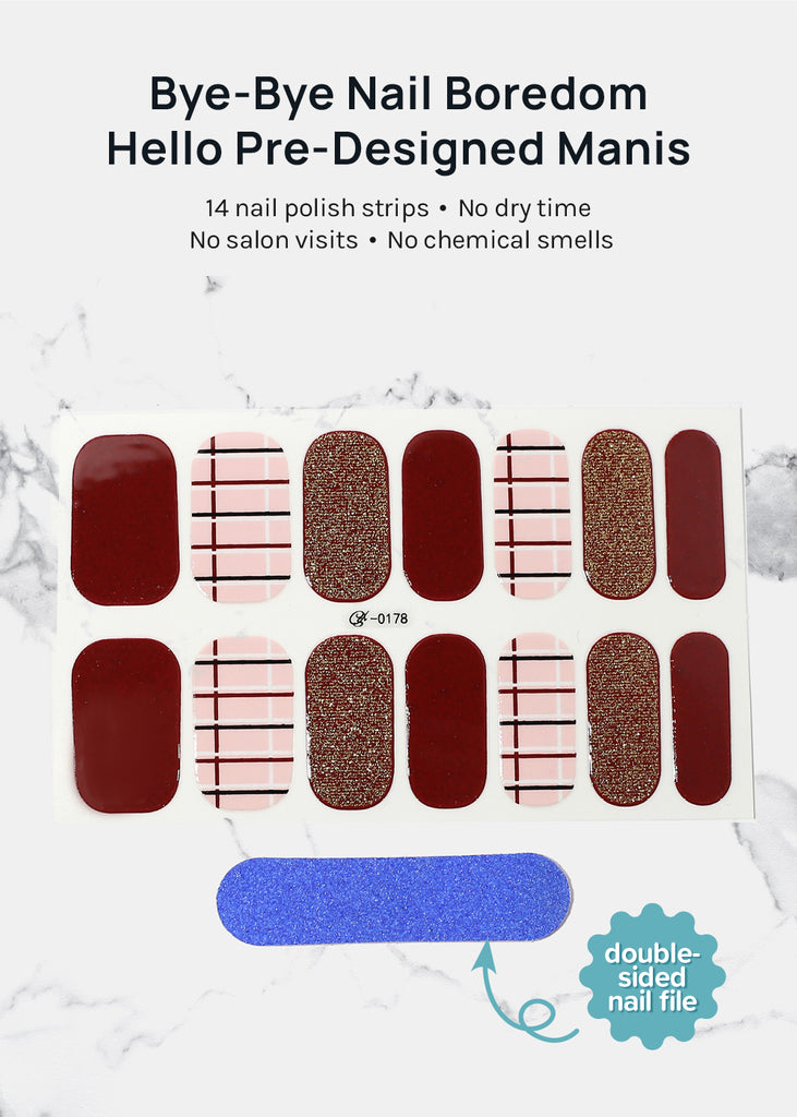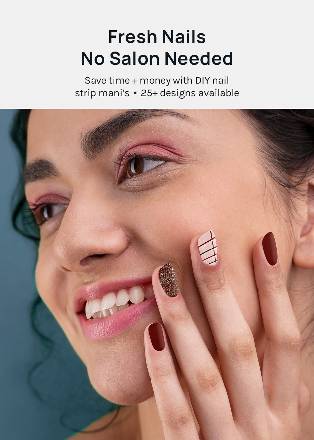 Bye-bye drying time! Create a perfect mani in minutes – just peel, stick, press + file!