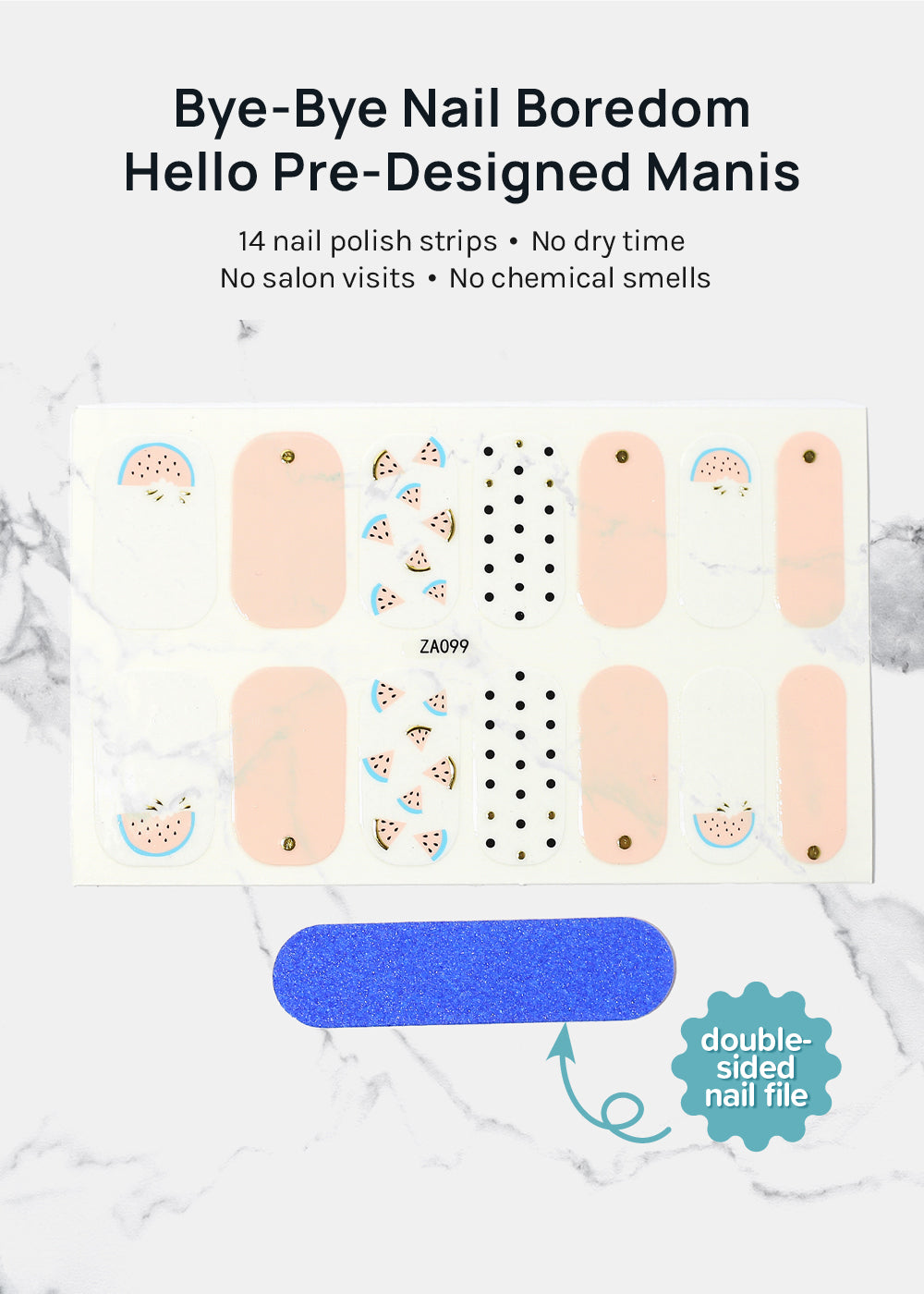 Includes 14 nail stickers + a double-sided nail file.