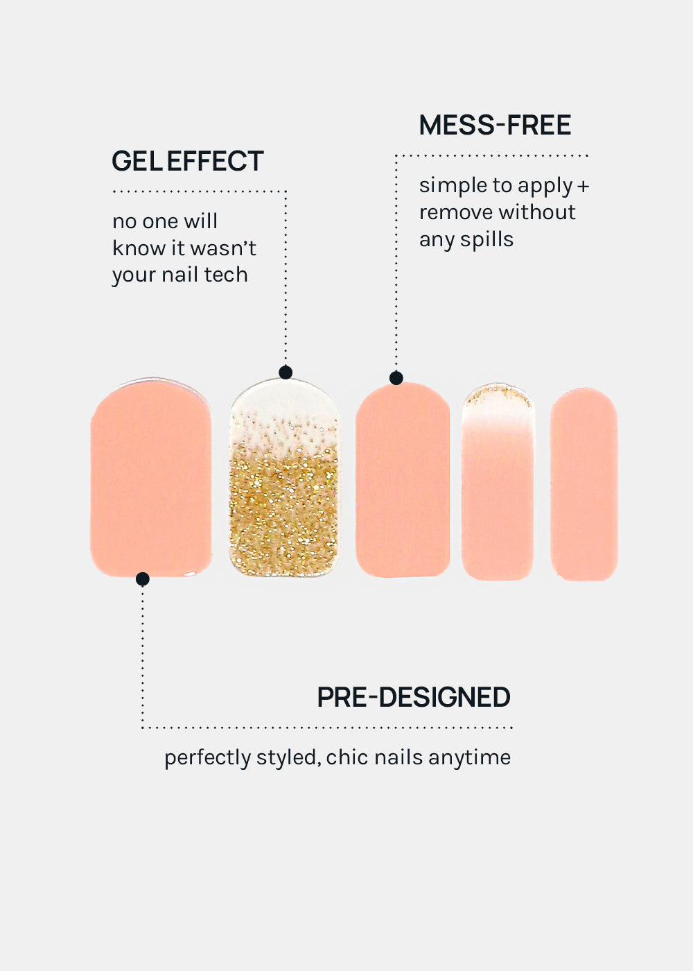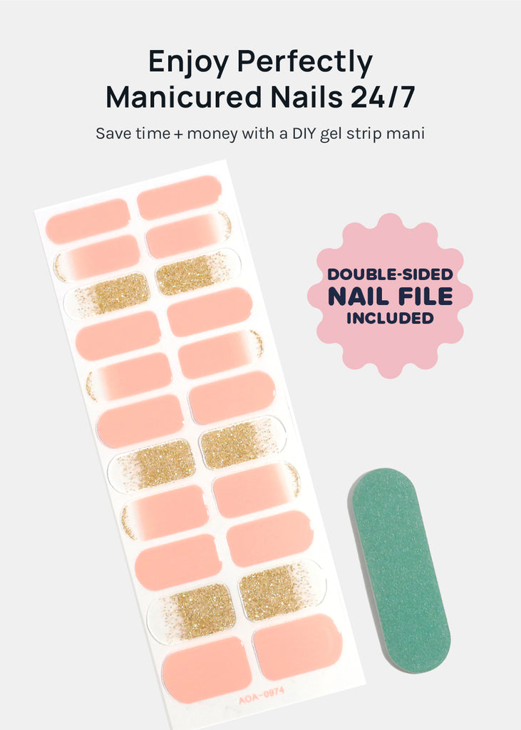 - Fold down excess over the tip of your nail + gently file downwards. Pro Tip: Apply a clear top coat for a glossy, longer-lasting finish.