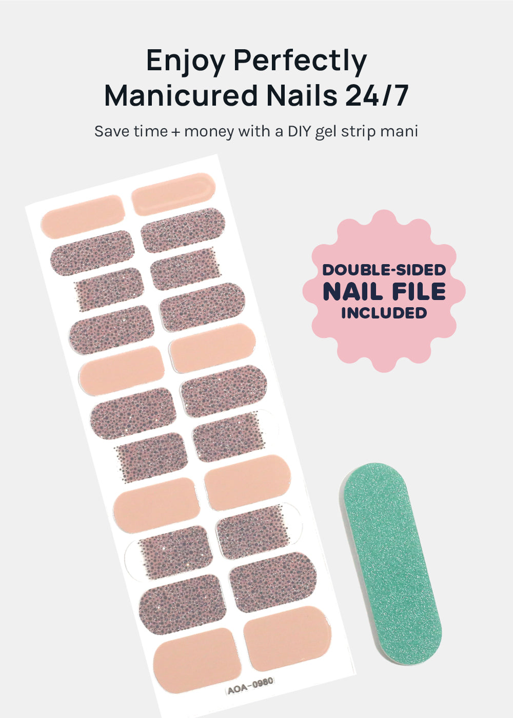 - Fold down excess over the tip of your nail + gently file downwards. Pro Tip: Apply a clear top coat for a glossy, longer-lasting finish.